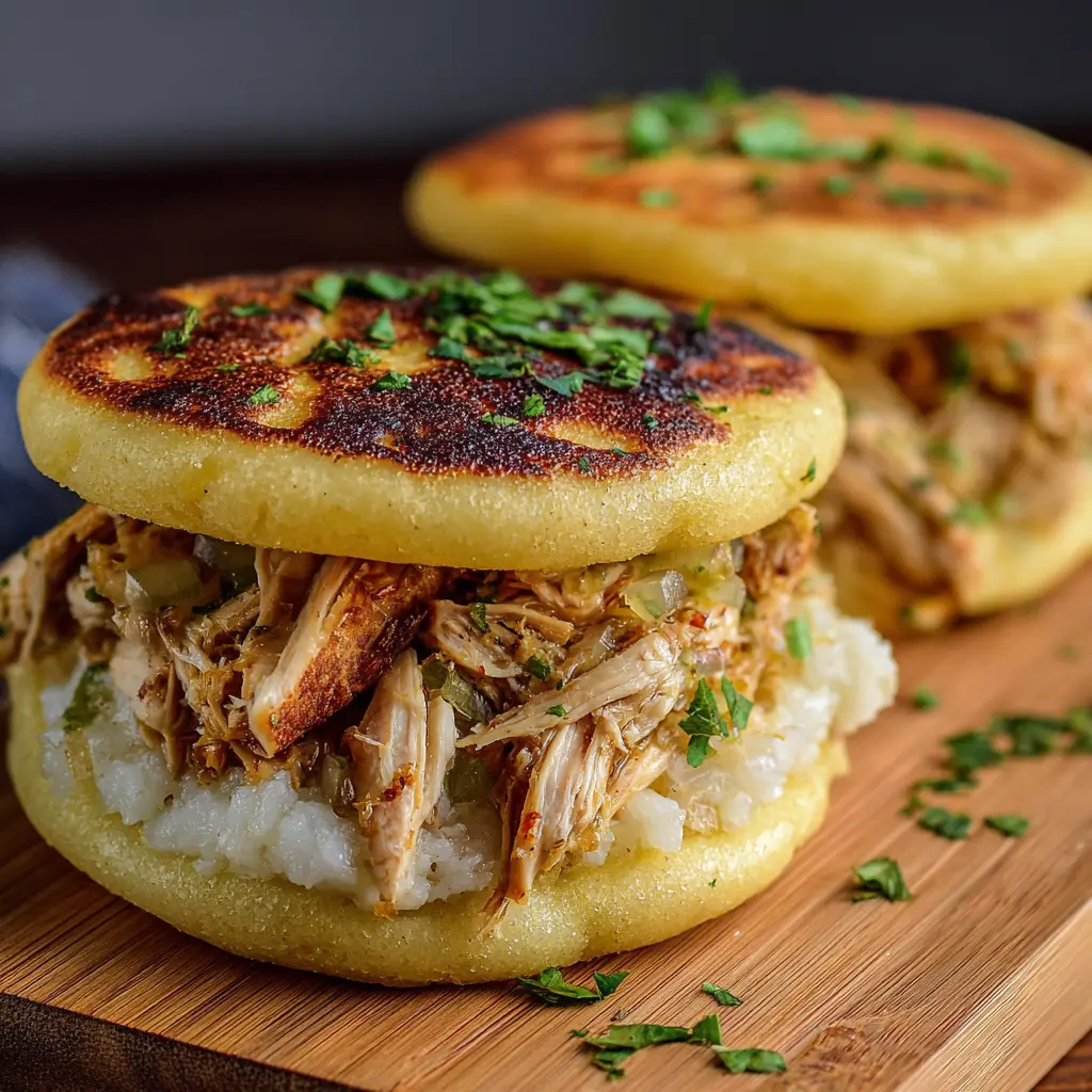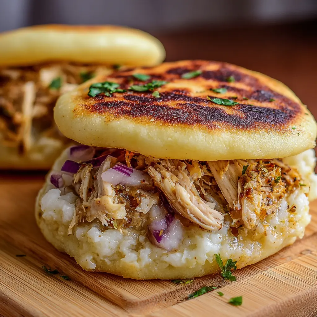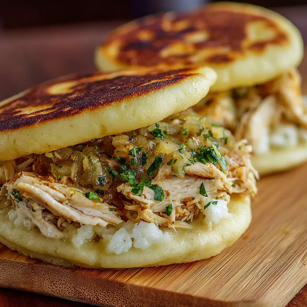 Usa pollo desmenuzado que hayas cocinado con especias como comino y ajo para un sabor más profundo. Las cebollas caramelizadas añaden un toque dulce que complementa perfectamente al pollo. Si quieres algo diferente, considera añadir un poco de queso fresco justo antes de cerrar la arepa.