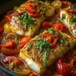 Ahora, estamos listos para incorporar el bacalao al sartén. Coloca las porciones de bacalao en la mezcla de verduras. Si te gusta, puedes añadir un poco de caldo de pollo para dar un extra de sabor. Cubre la sartén y cocina durante unos 15-20 minutos. Es vital que utilices una tapa; así, el bacalao se cocina al vapor y queda jugoso y tierno.