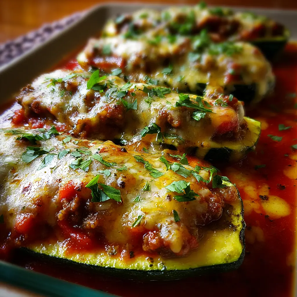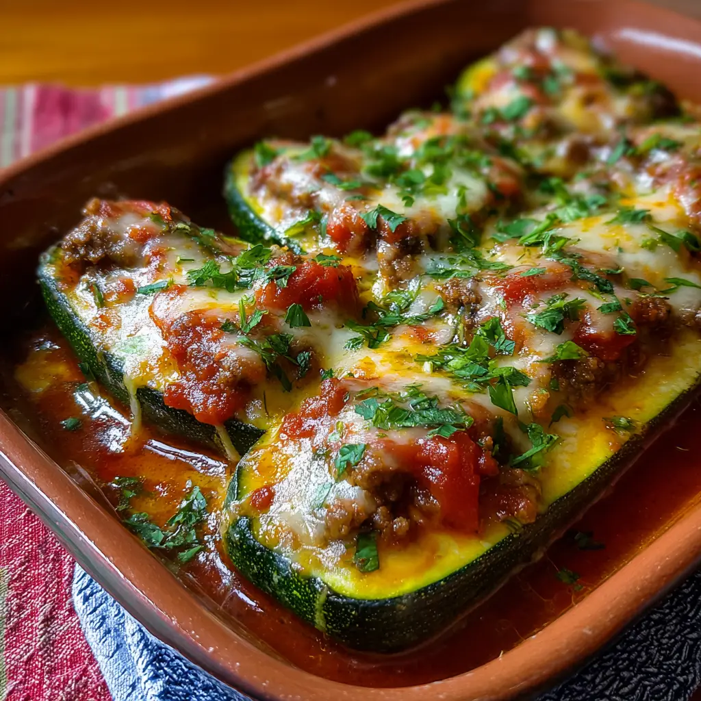 Deliciosos calabacines rellenos de carne, cubiertos con salsa de tomate y gratinados al horno, una receta perfecta para cualquier ocasión.