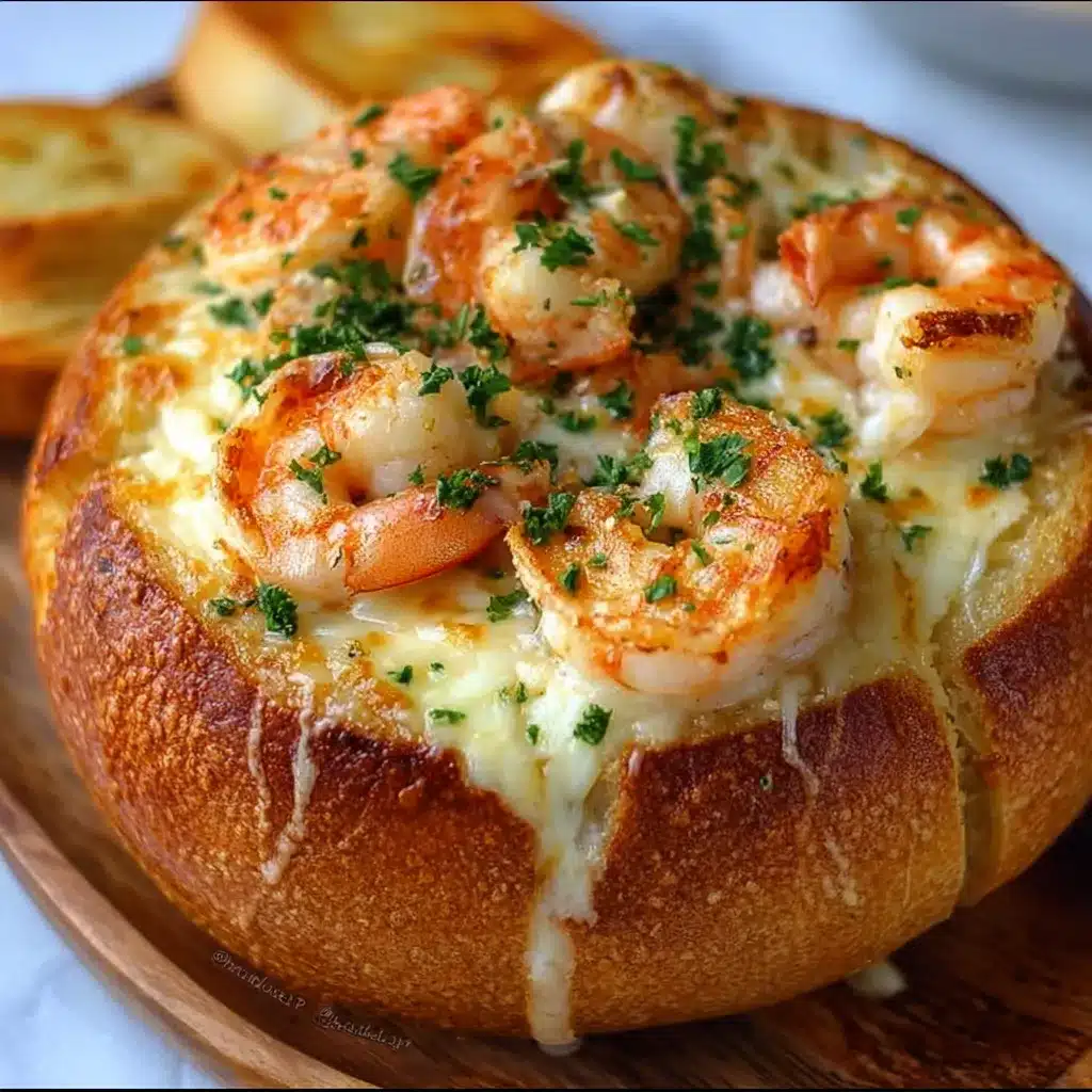 Tazón de pan con camarones al ajo y queso: receta fácil y deliciosa