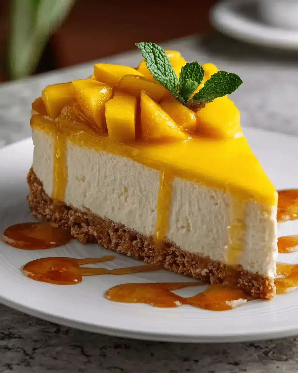 Disfruta de un delicioso cheesecake frío de mango, perfecto para cualquier ocasión y fácil de preparar en casa.