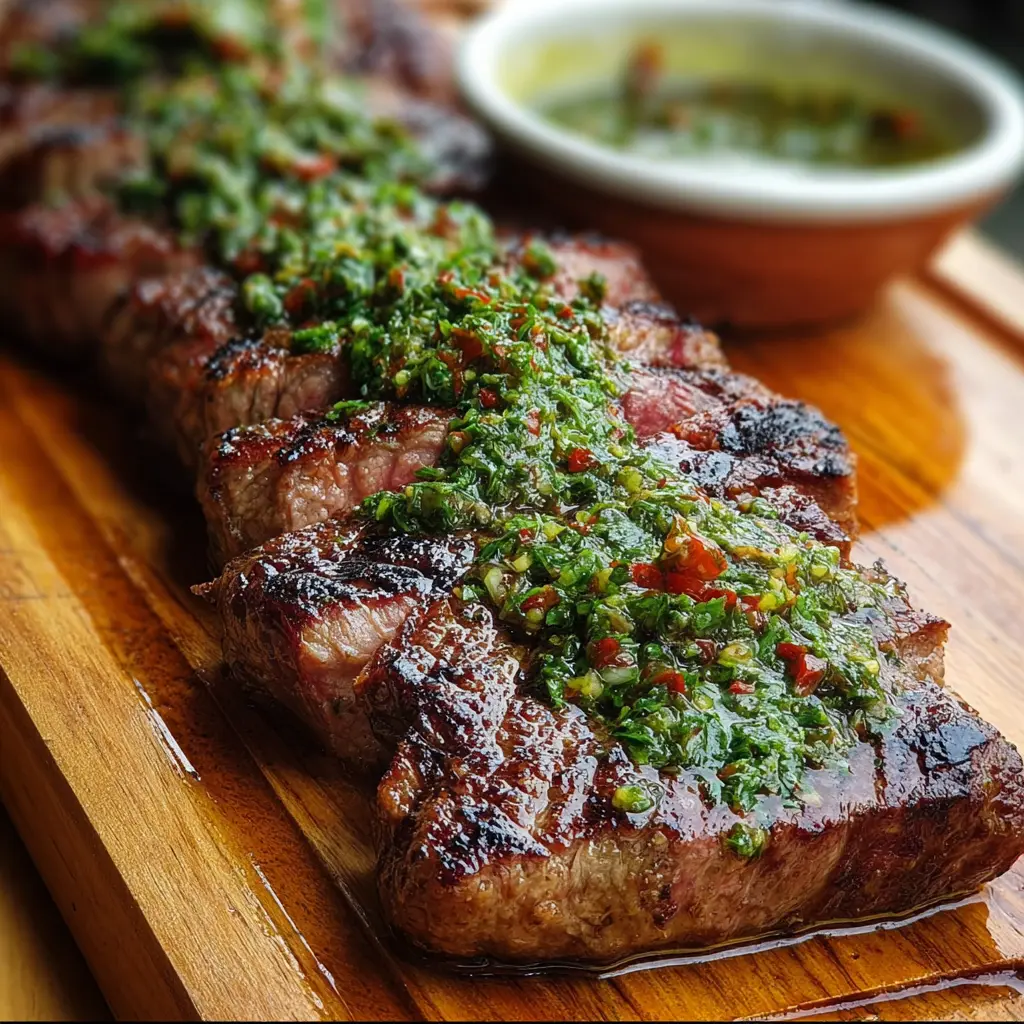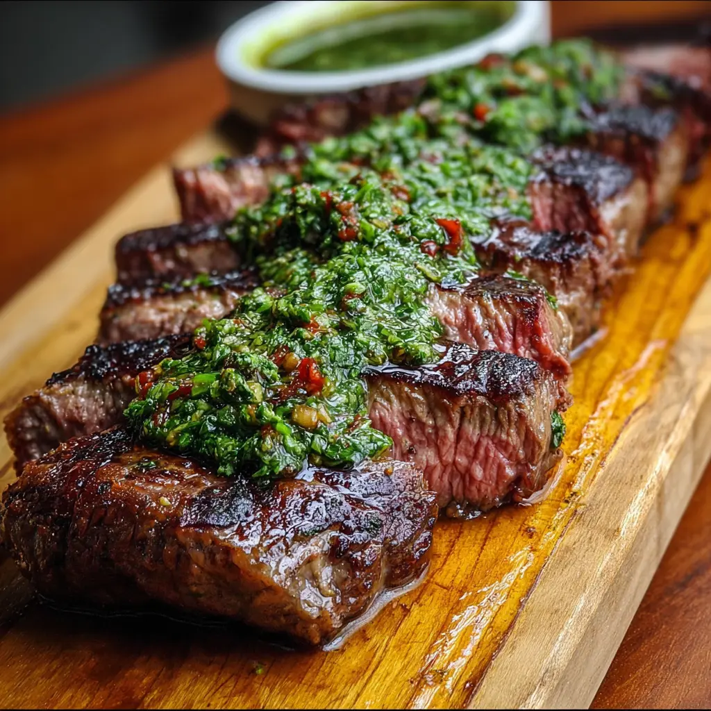 Delicioso churrasco marinado y servido con una salsa chimichurri fresca y aromática.