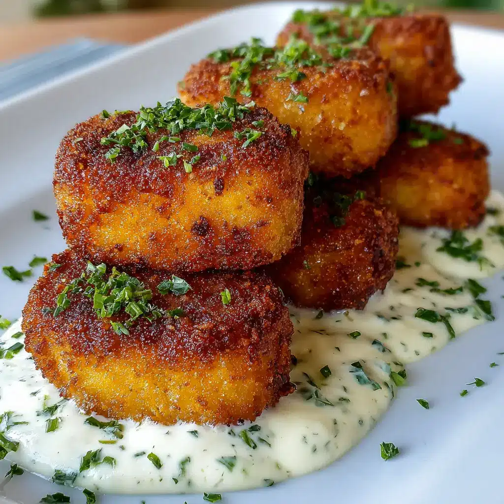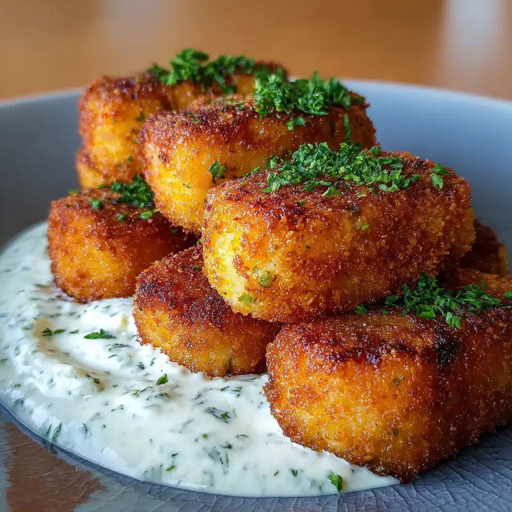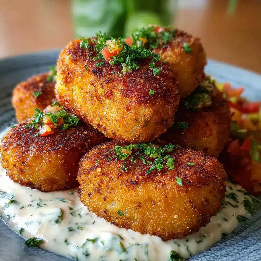 Las Croquetas Crujientes de Atún son una deliciosa opción para cualquier comida, servidas con una salsa cremosa de hierbas que realza su sabor.