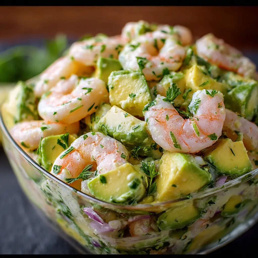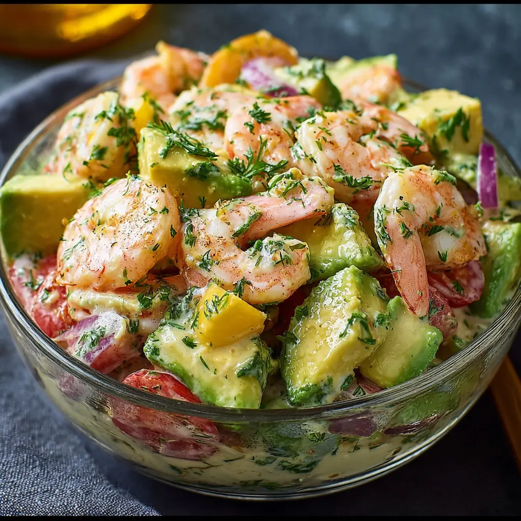 Disfruta de una ensalada cremosa de camarones y aguacate que es fácil de preparar y deliciosa, perfecta para cualquier ocasión.