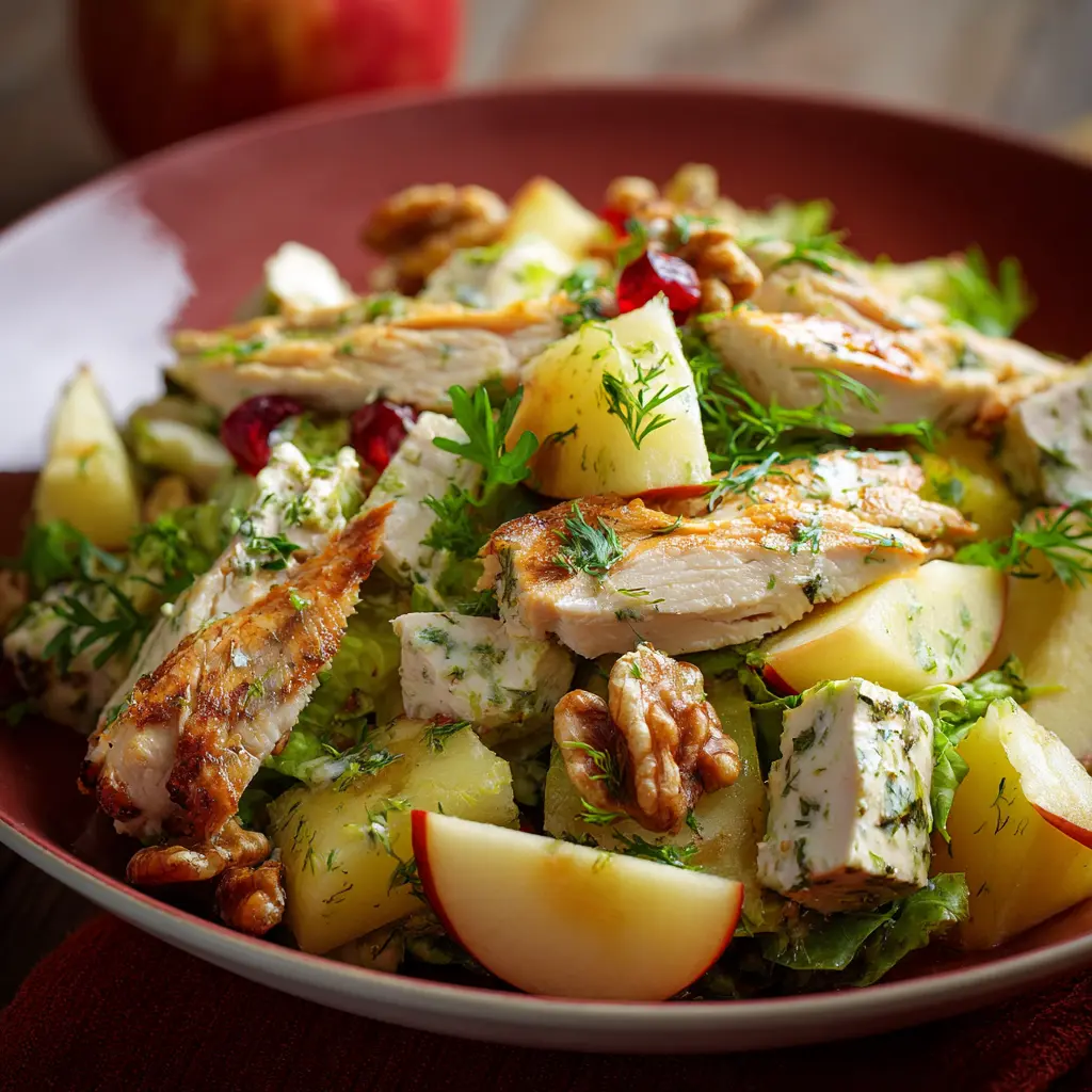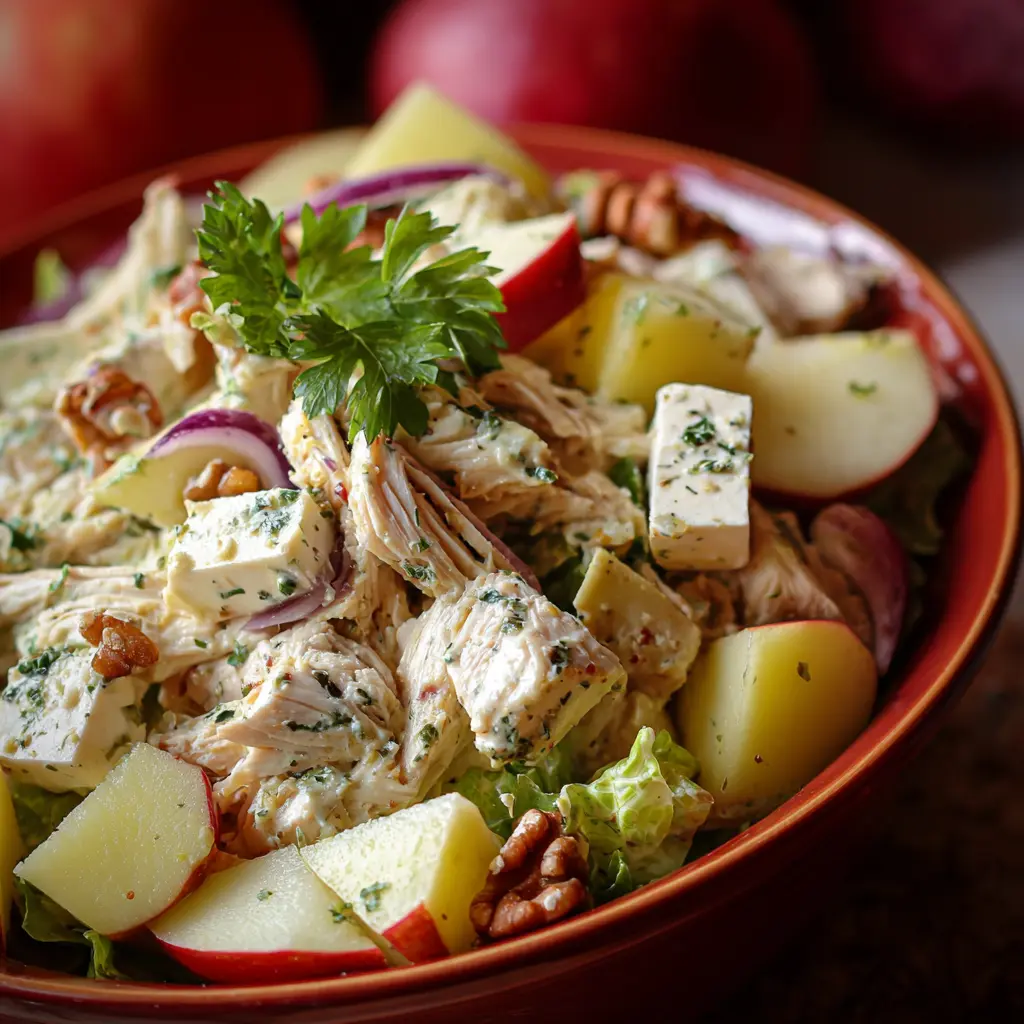 Disfruta de una ensalada refrescante que combina pollo tierno, papas suaves y manzanas crujientes, ideal para un almuerzo saludable.