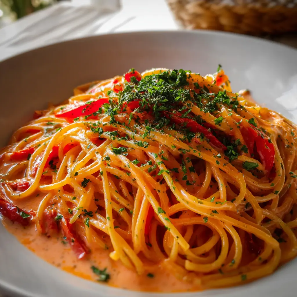 Disfruta de una deliciosa receta de espagueti al morrón con salsa rosa, perfecta para cualquier ocasión.