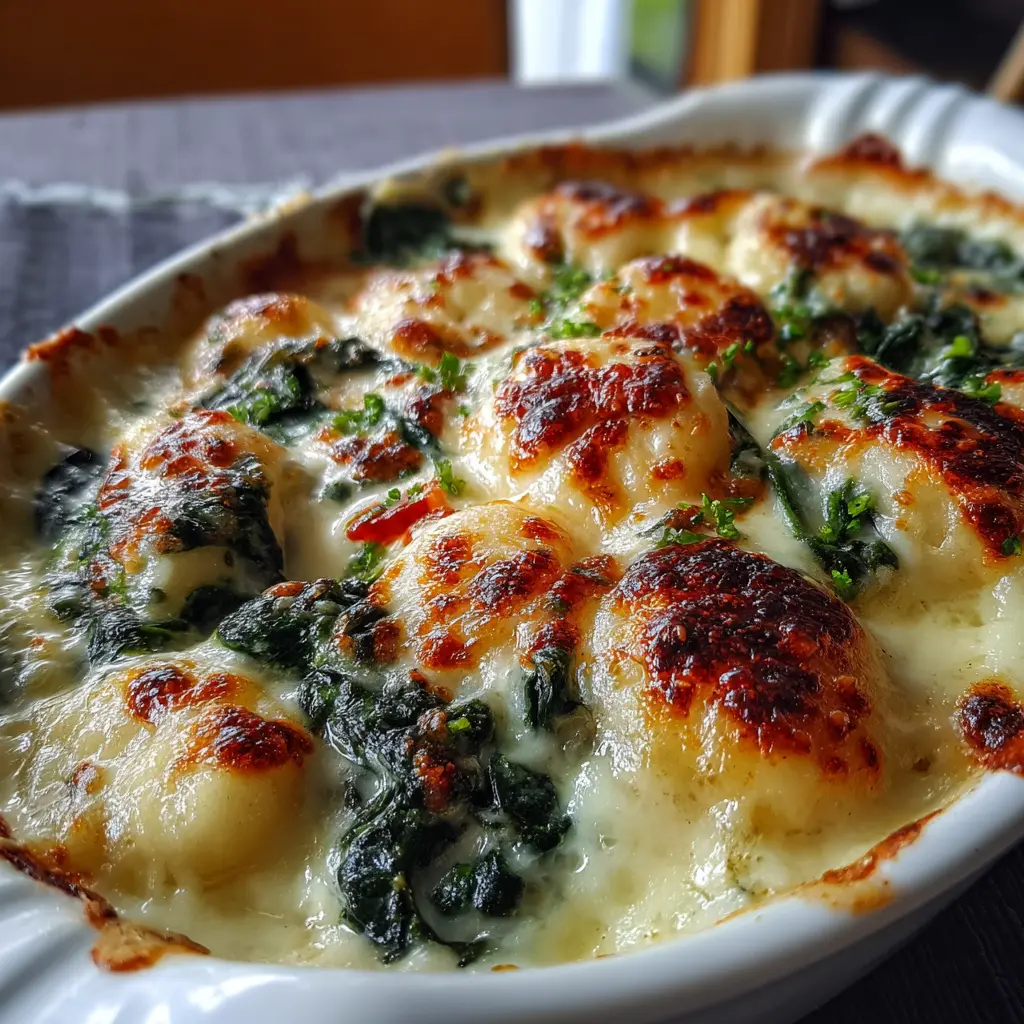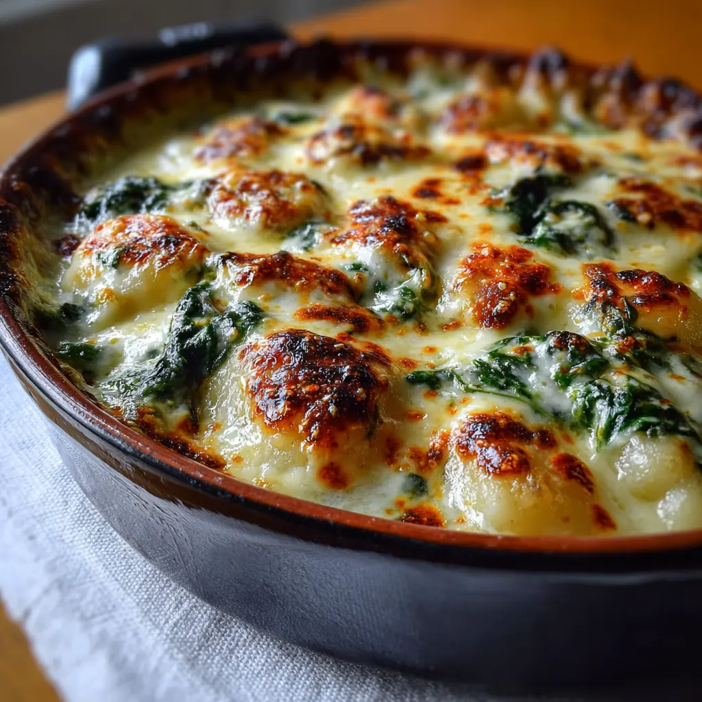 Disfruta de unos gnocchis gratinados con espinacas y una cremosa salsa de queso que son perfectos para cualquier ocasión.
