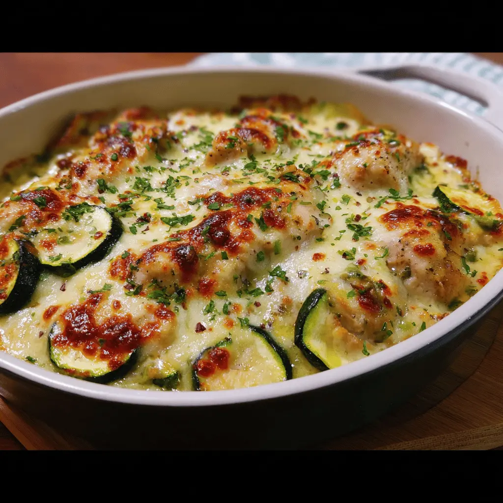 Disfruta de esta receta fácil de gratín cremoso de calabacitas y pollo, ideal para una cena rápida y deliciosa.