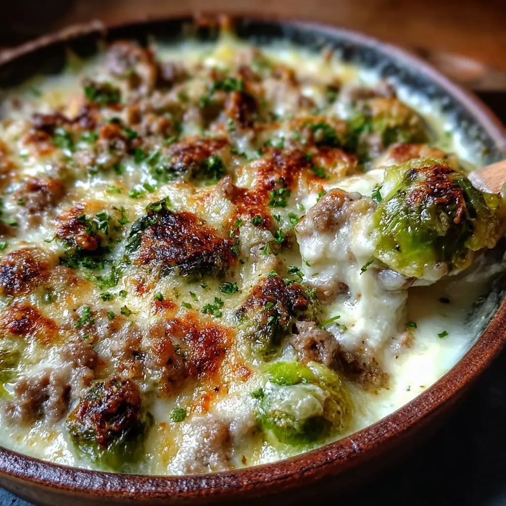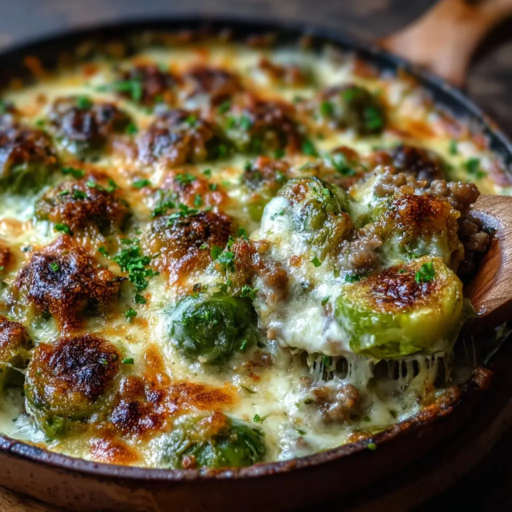 Disfruta de un delicioso gratinado cremoso de coles de Bruselas con parmesano y carne, perfecto para cualquier ocasión.