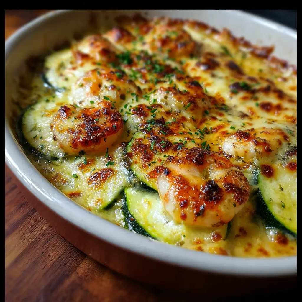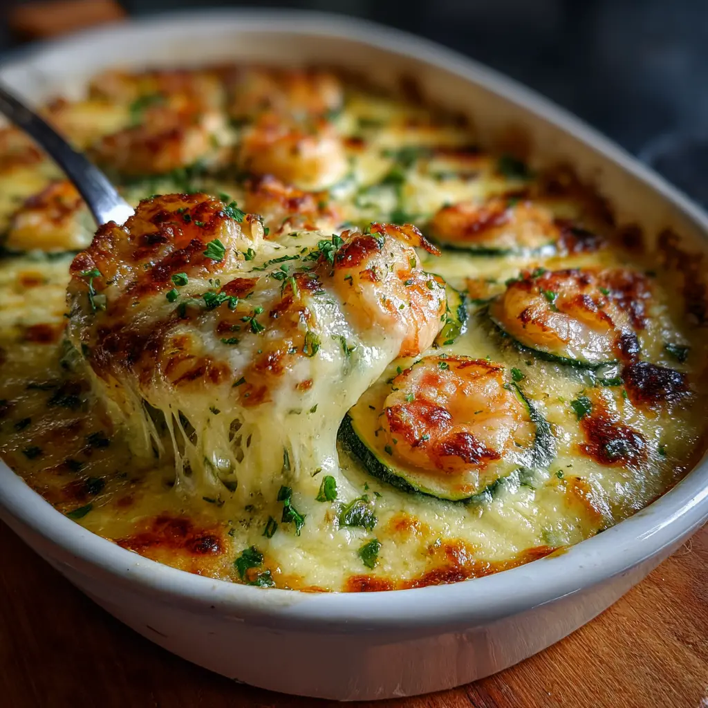 Gratinado ligero de langostinos: delicioso con calabacín y queso dorado