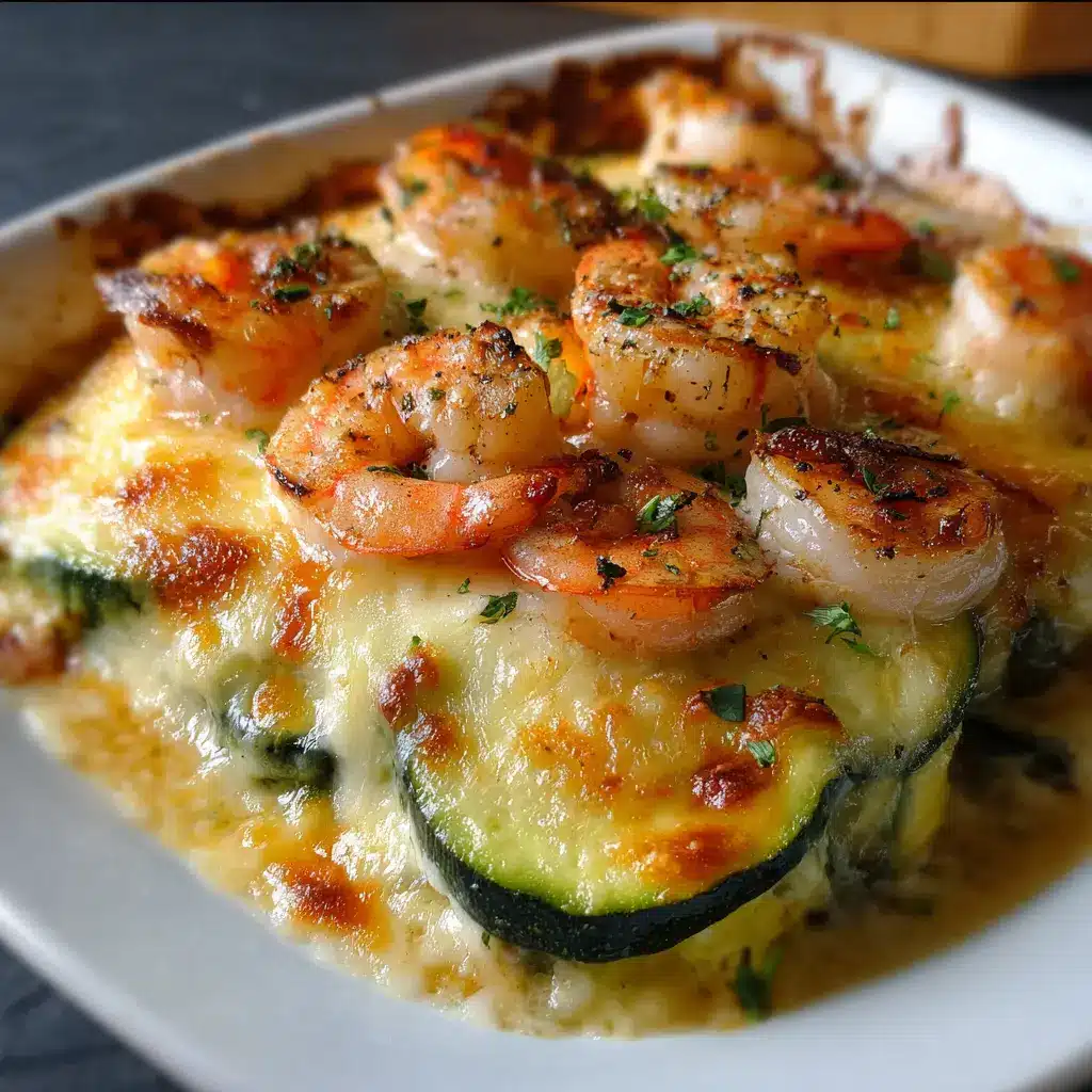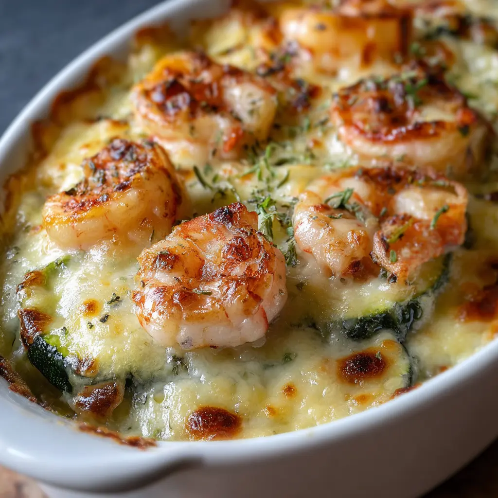 Gratinado ligero de langostinos y calabacín con queso dorado delicioso