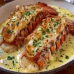 Con la salsa lista, coloca las colas de langosta en un plato para hornear. Vierte generosamente la salsa cremosa sobre ellas, asegurándote de cubrir bien cada porción. Este es el momento en que la magia empieza a suceder; la langosta empezará a absorber todos esos sabores agradables de la salsa.