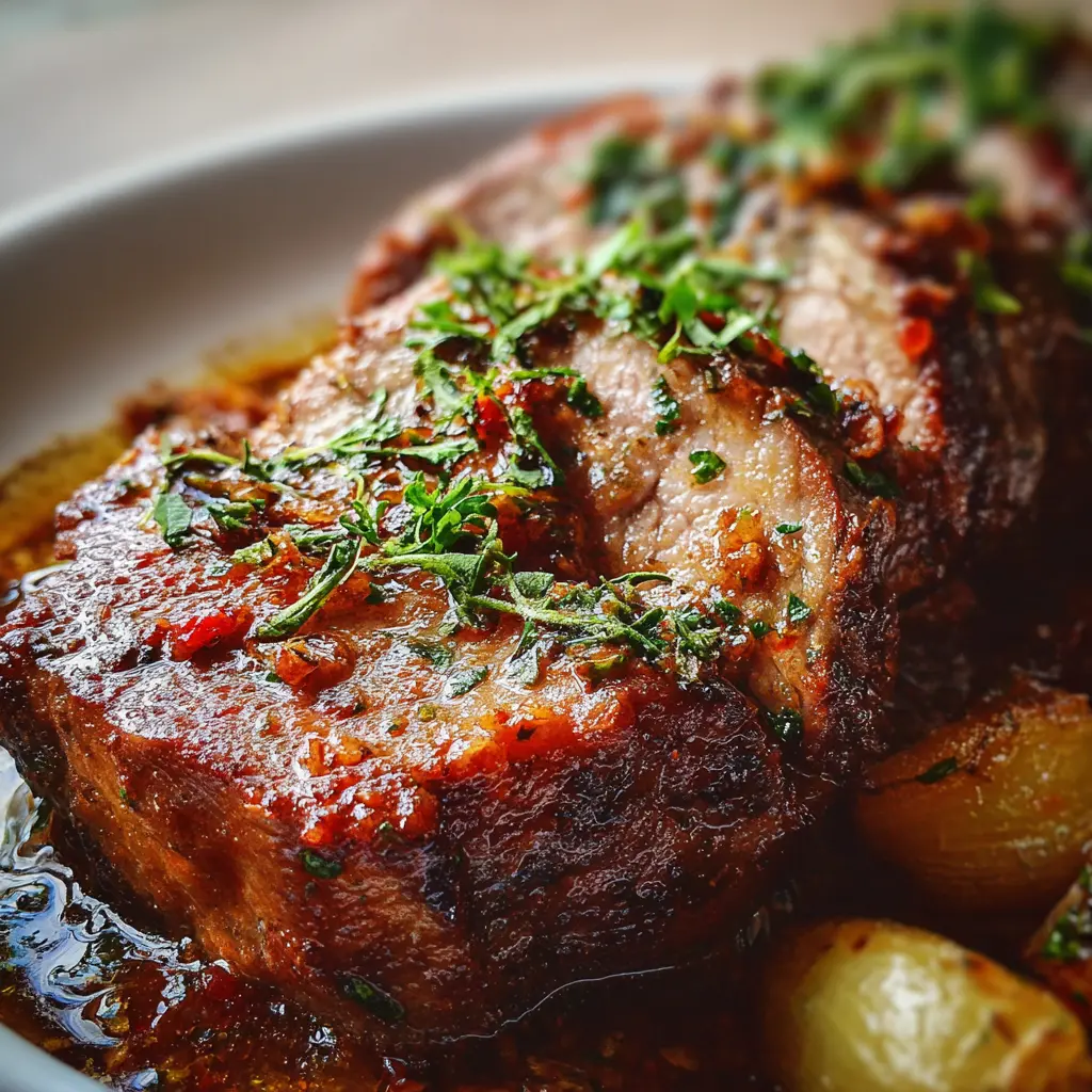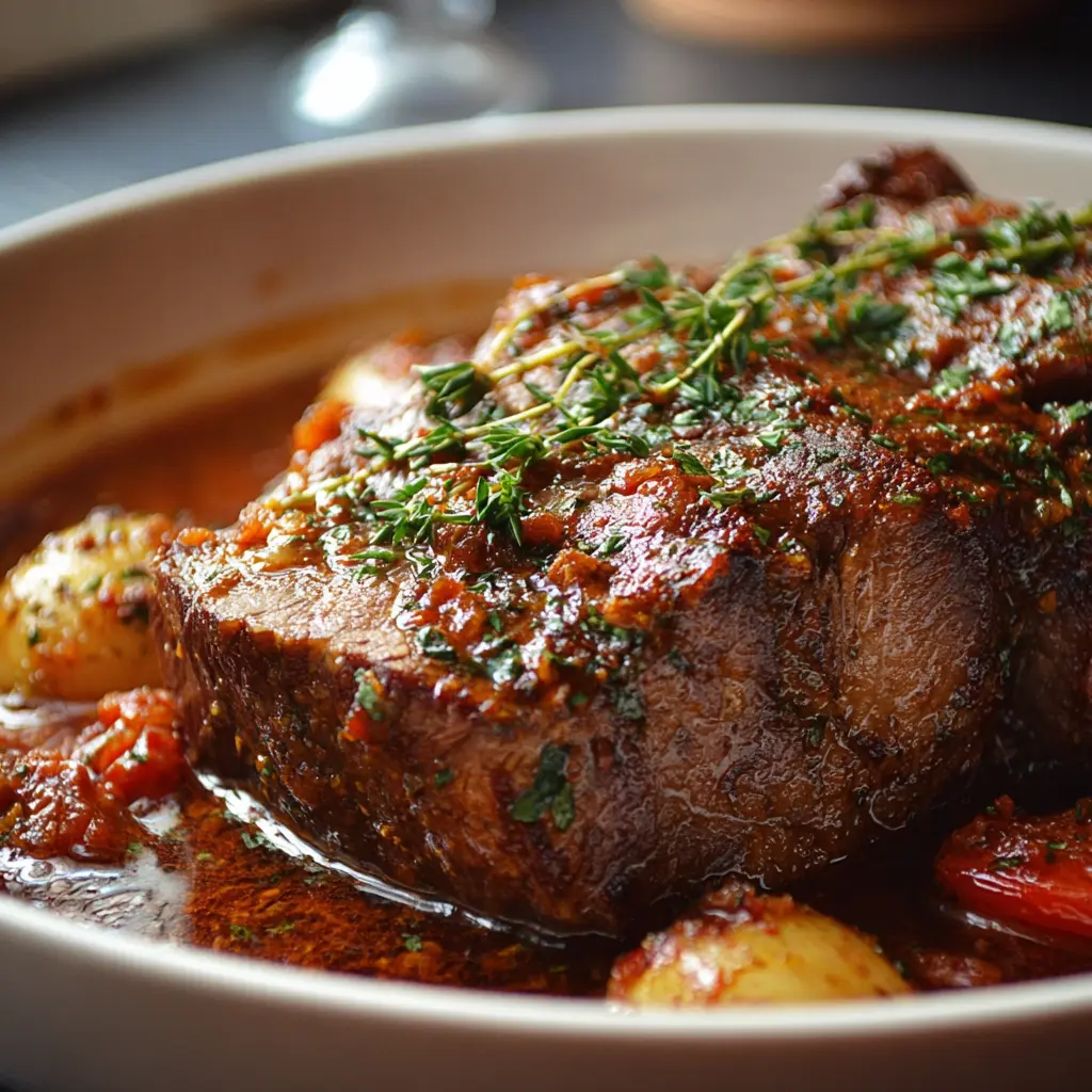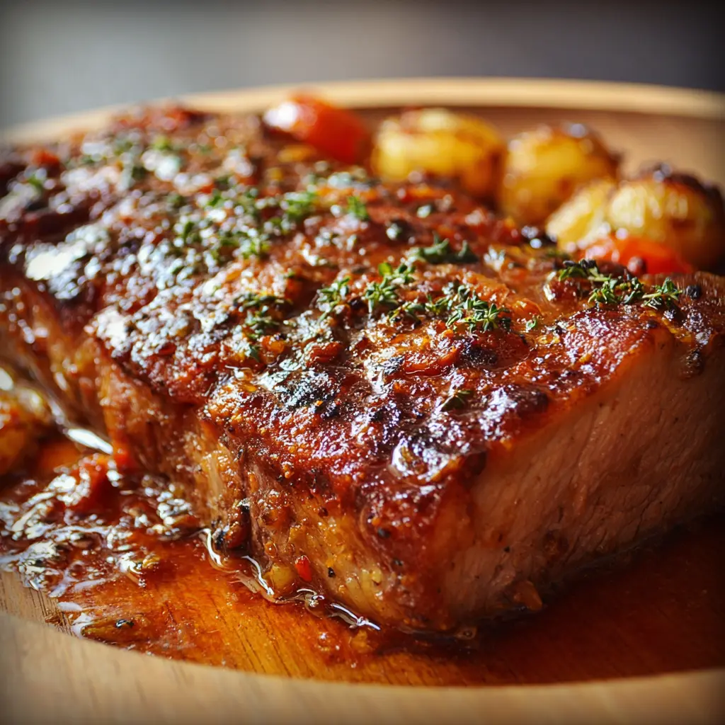 Delicioso lomo de res cocido en una rica salsa y horneado a la perfección, ideal para compartir en una cena especial.