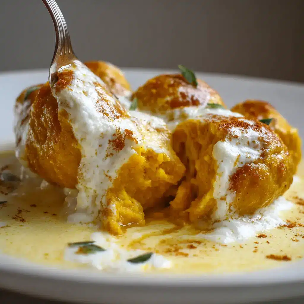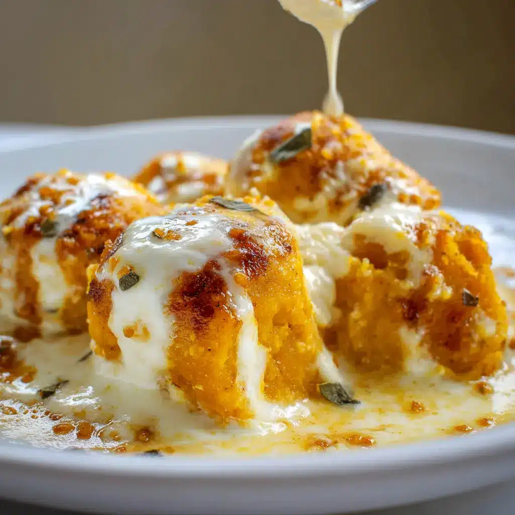 Deliciosos malfatti de calabaza acompañados de una suave crema de queso, perfectos para cualquier ocasión.