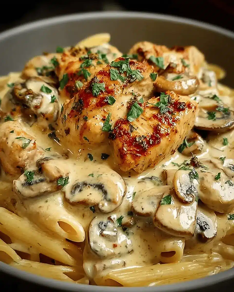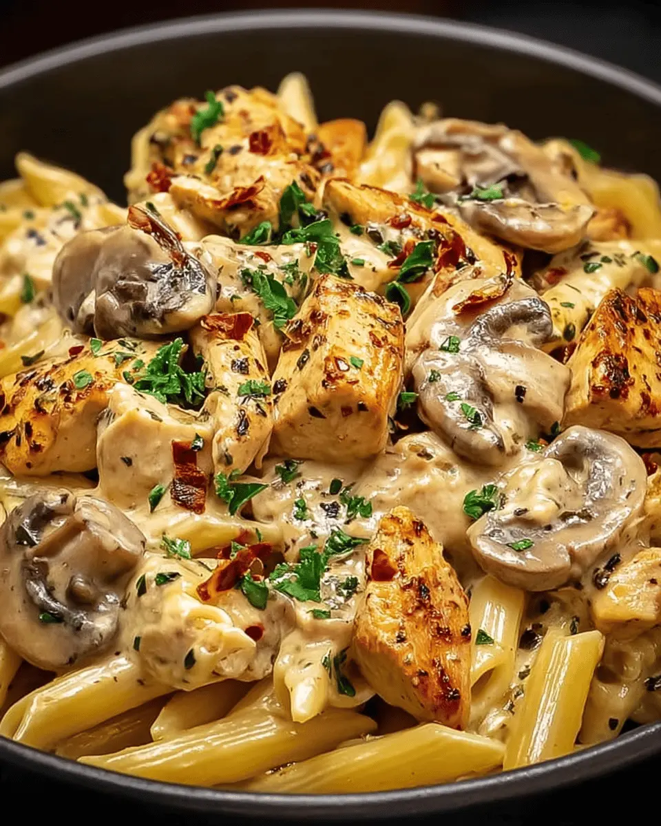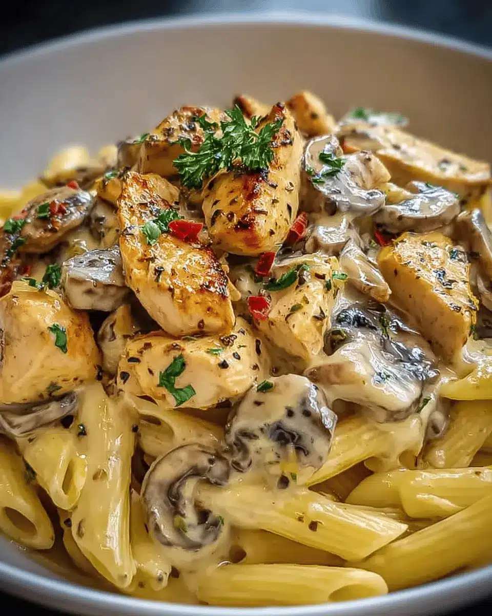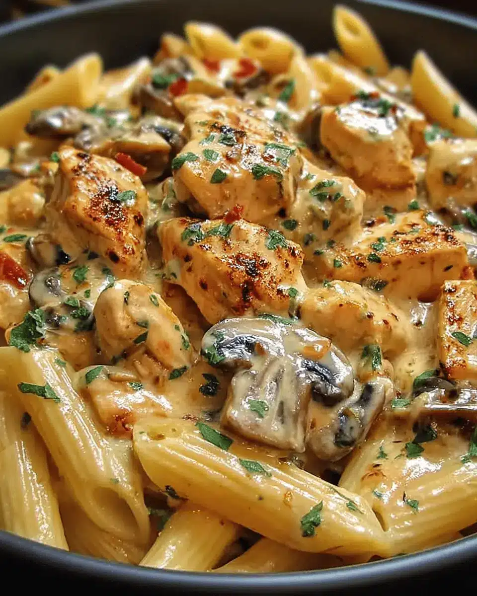 Disfruta de esta exquisita receta de Pasta de Pollo y Champiñones en Salsa de Crema, perfecta para una cena especial en casa.