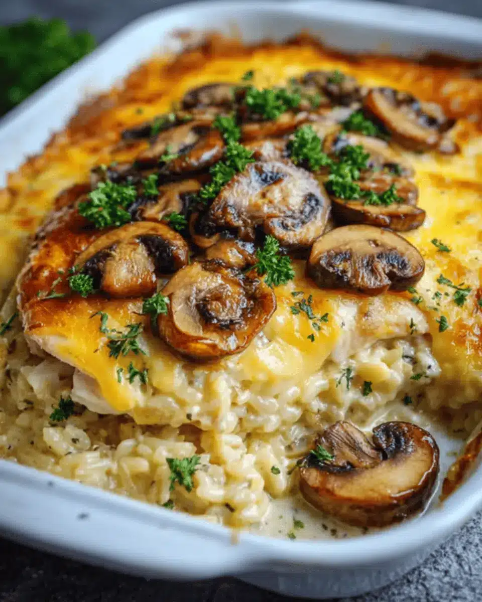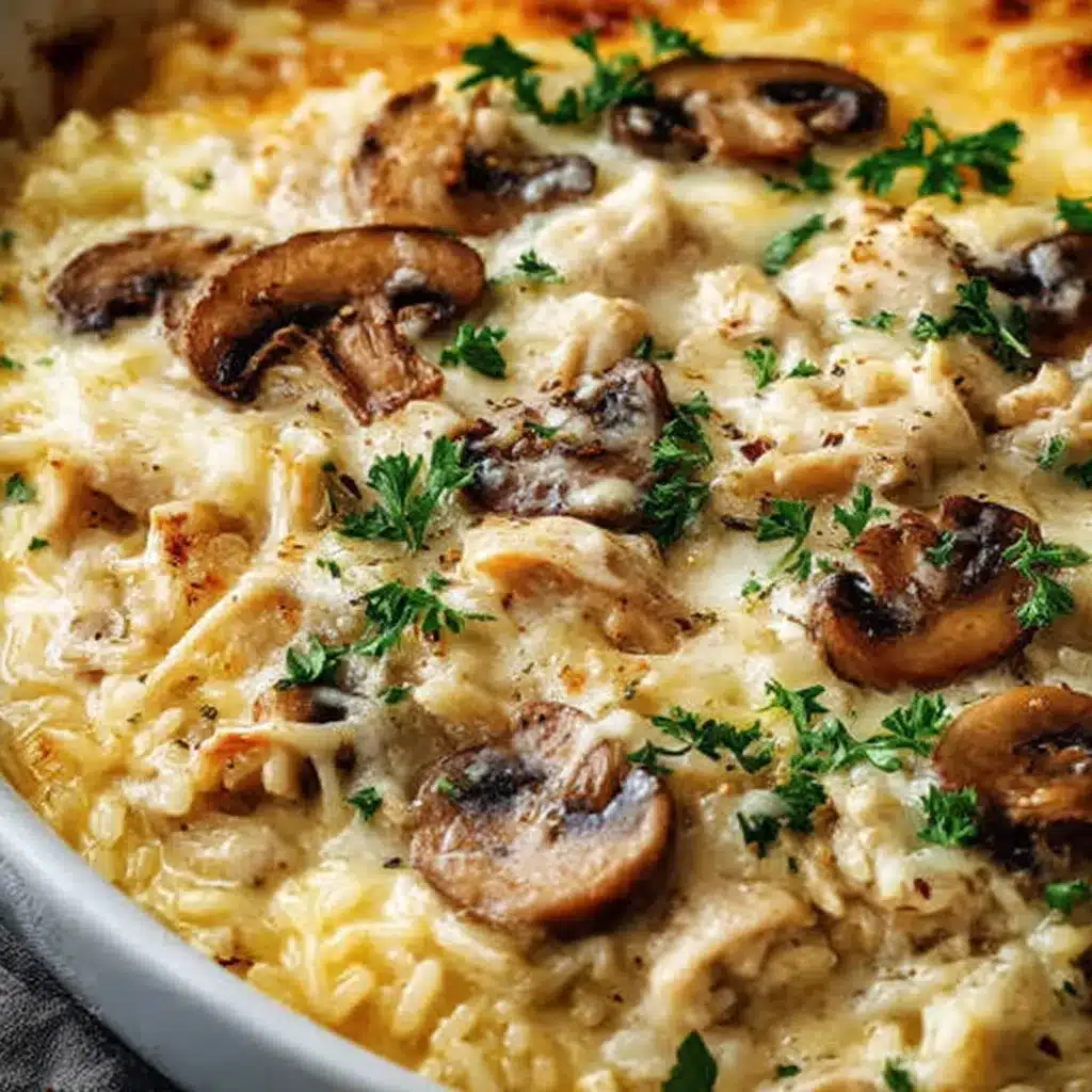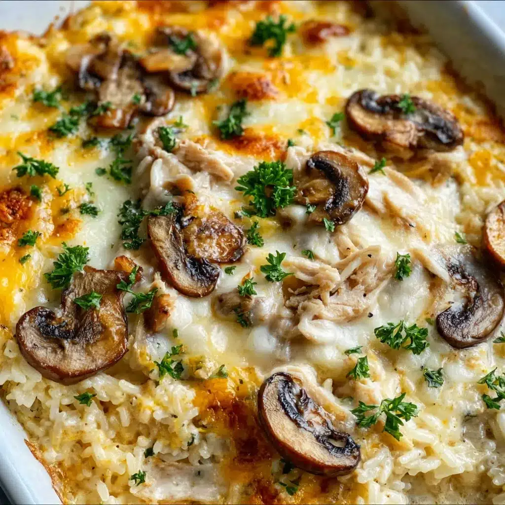 Este pastel cremoso de arroz, pollo y champiñones gratinado es una opción fácil y deliciosa para una comida reconfortante que encantará a todos.