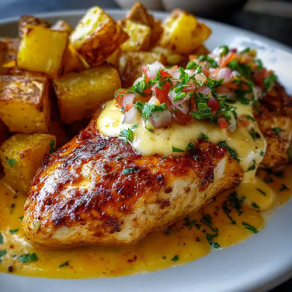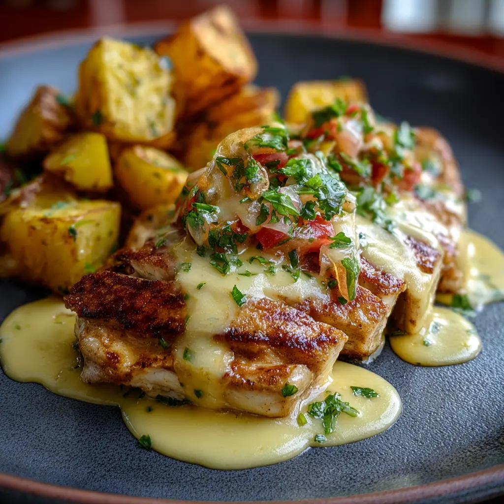 Una vez que el pollo esté burbujeante y dorado, retíralo del horno. Sirve la pechuga de pollo con salsa de queso en platos individuales, asegurándote de incluir las delicias de papas al lado. Espolvorea un poco de perejil fresco picado por encima para darle un toque de color y frescura.
