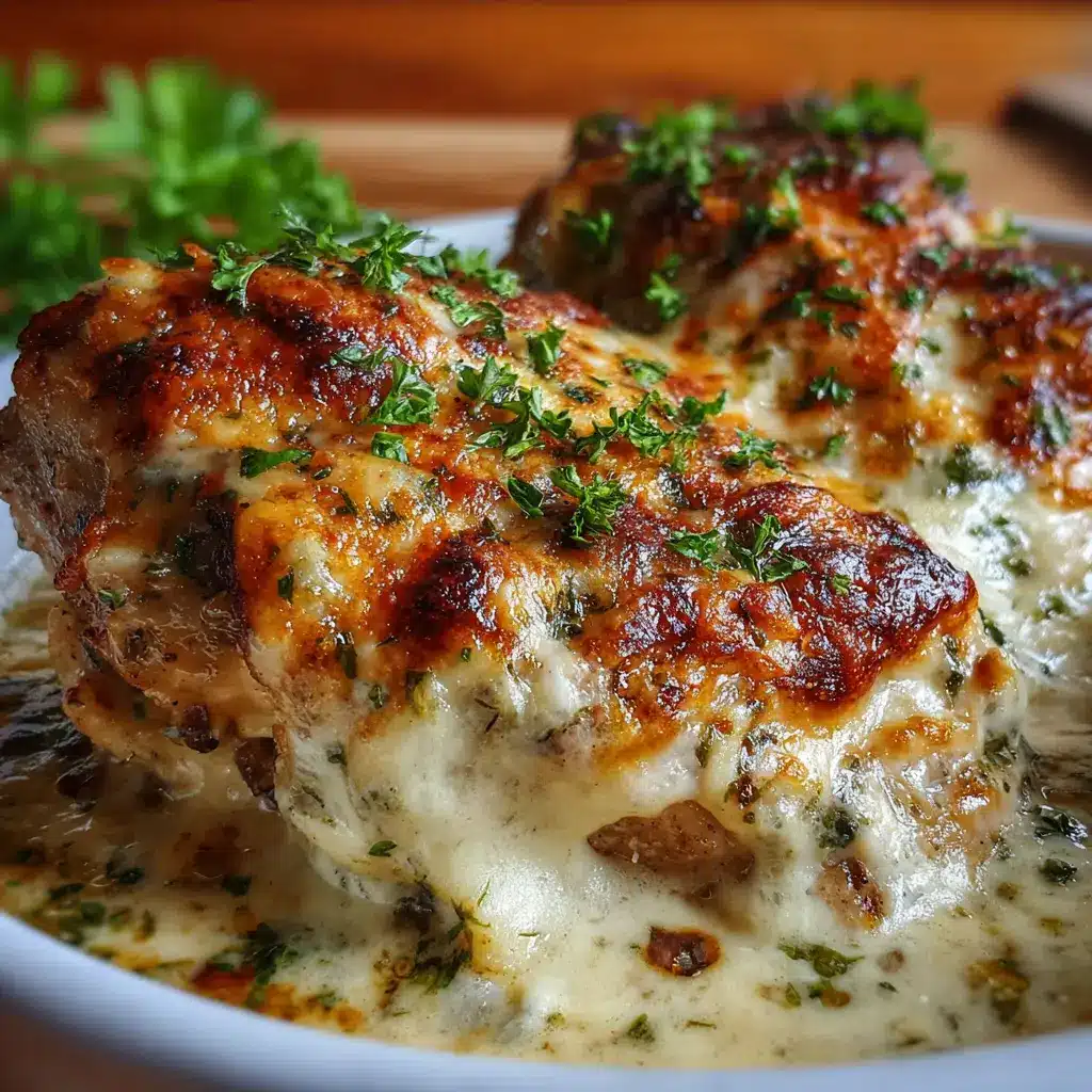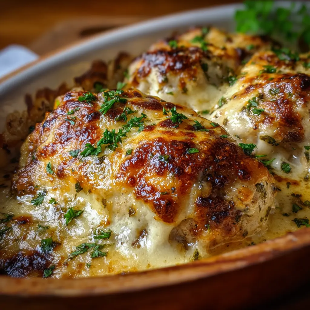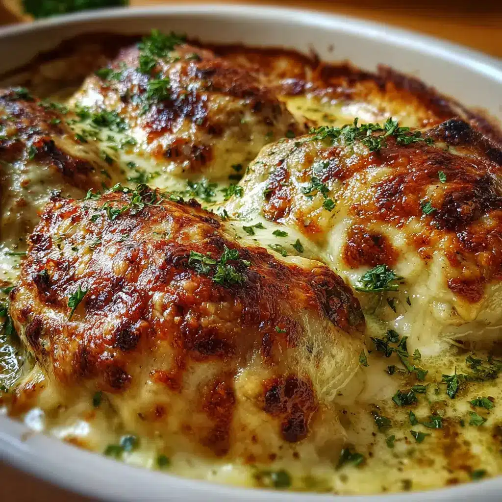 Finalmente, transfiere las pechugas doradas a un refractario. Cubre con un poco más de queso y, si lo deseas, espolvorea algunas hierbas frescas. Hornea a 180°C durante 25-30 minutos, o hasta que el pollo esté bien cocido y el queso burbujeante y dorado.