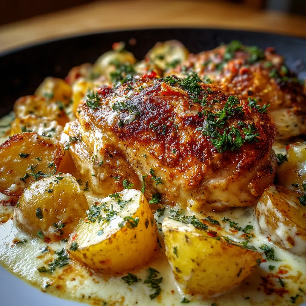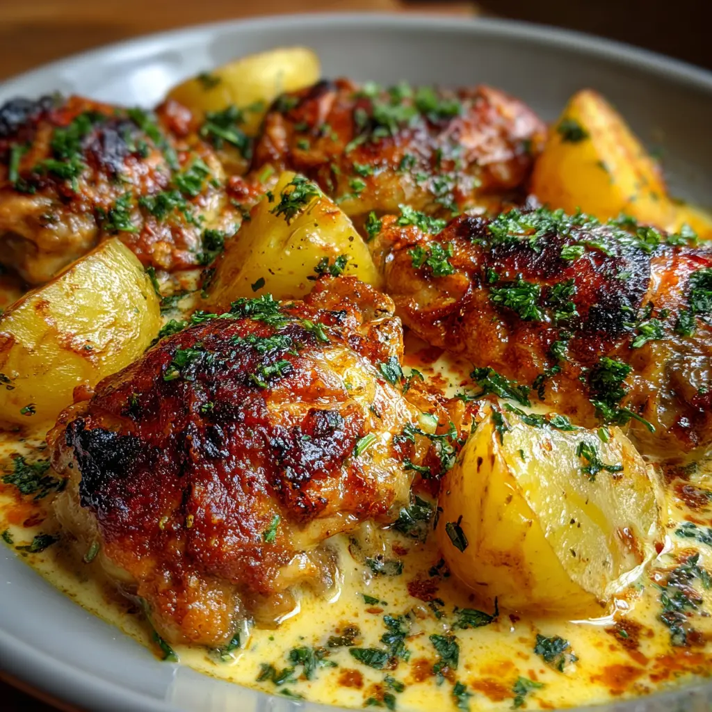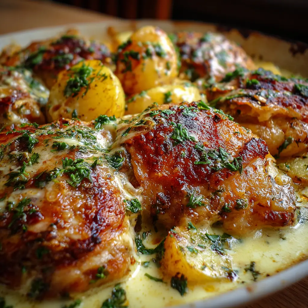 Disfruta de un delicioso pollo al horno con patatas en una salsa cremosa de queso, perfecto para una comida familiar o una cena especial.