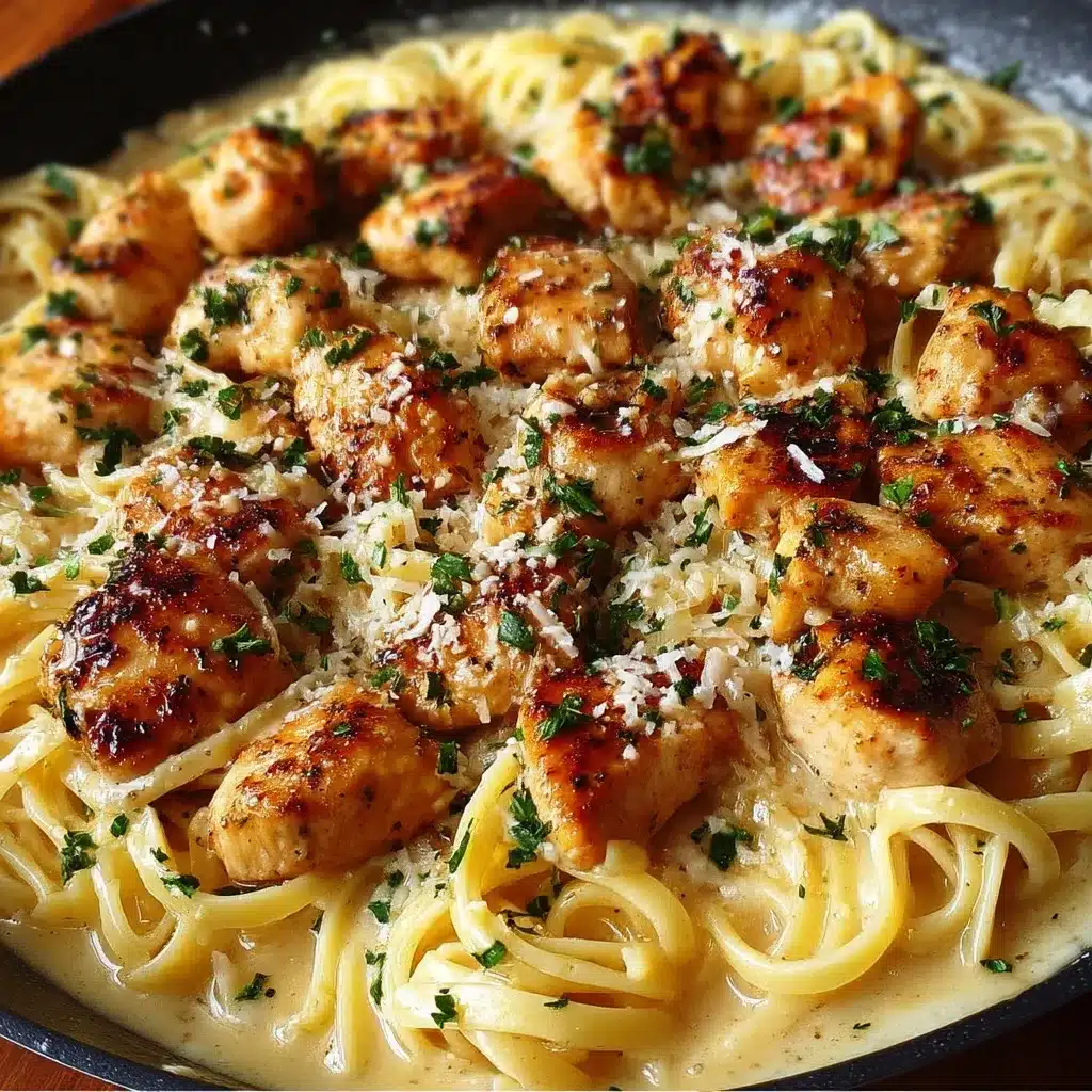 Finalmente, incorpora el linguine a la sartén con la salsa y el pollo. Mezcla todo delicadamente para asegurarte de que cada espagueti esté cubierto con esa deliciosa salsa cremosa de parmesano. Sirve caliente, decorado con hojas frescas de albahaca para realzar los sabores.