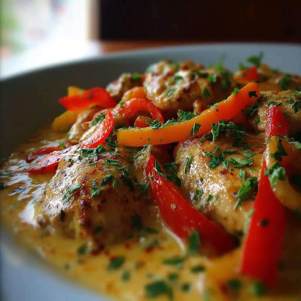 Disfruta de esta deliciosa receta de Pollo con Pimientos en Salsa de Crema, perfecta para una cena en familia o con amigos.