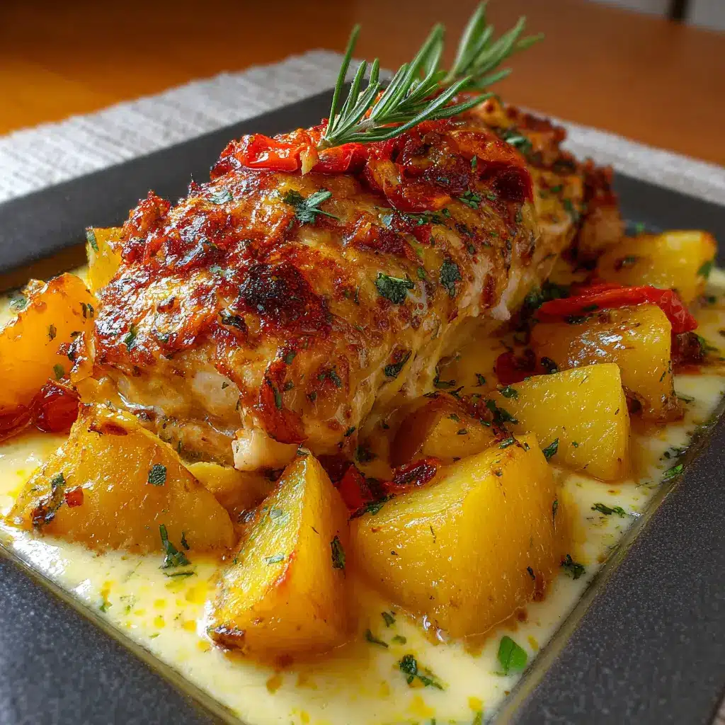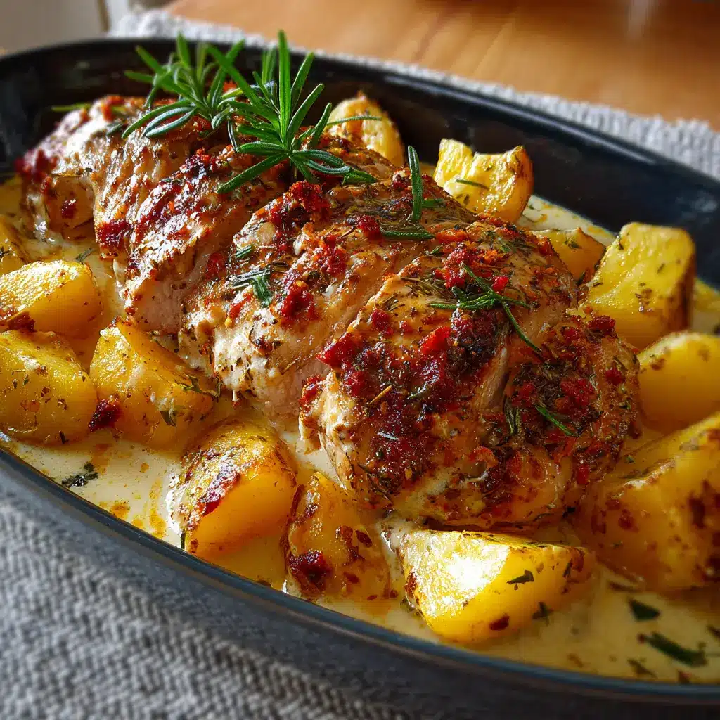 La combinación de pollo cremoso y papas al horno hace que este plato sea increíblemente satisfactorio, ¡y seguro que dejarás a todos pidiendo más!