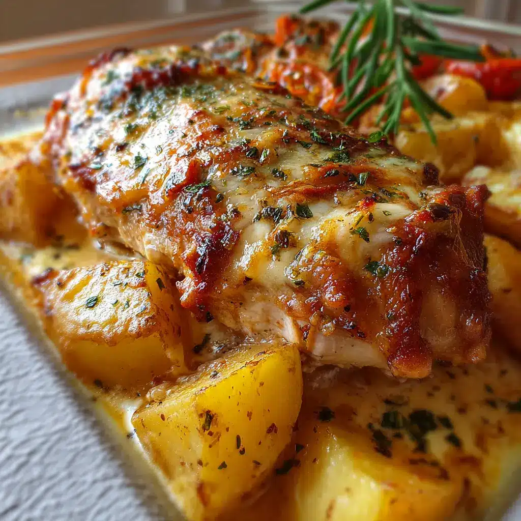 Un delicioso y cremoso plato de pollo acompañado de papas al horno, perfecto para una cena familiar.