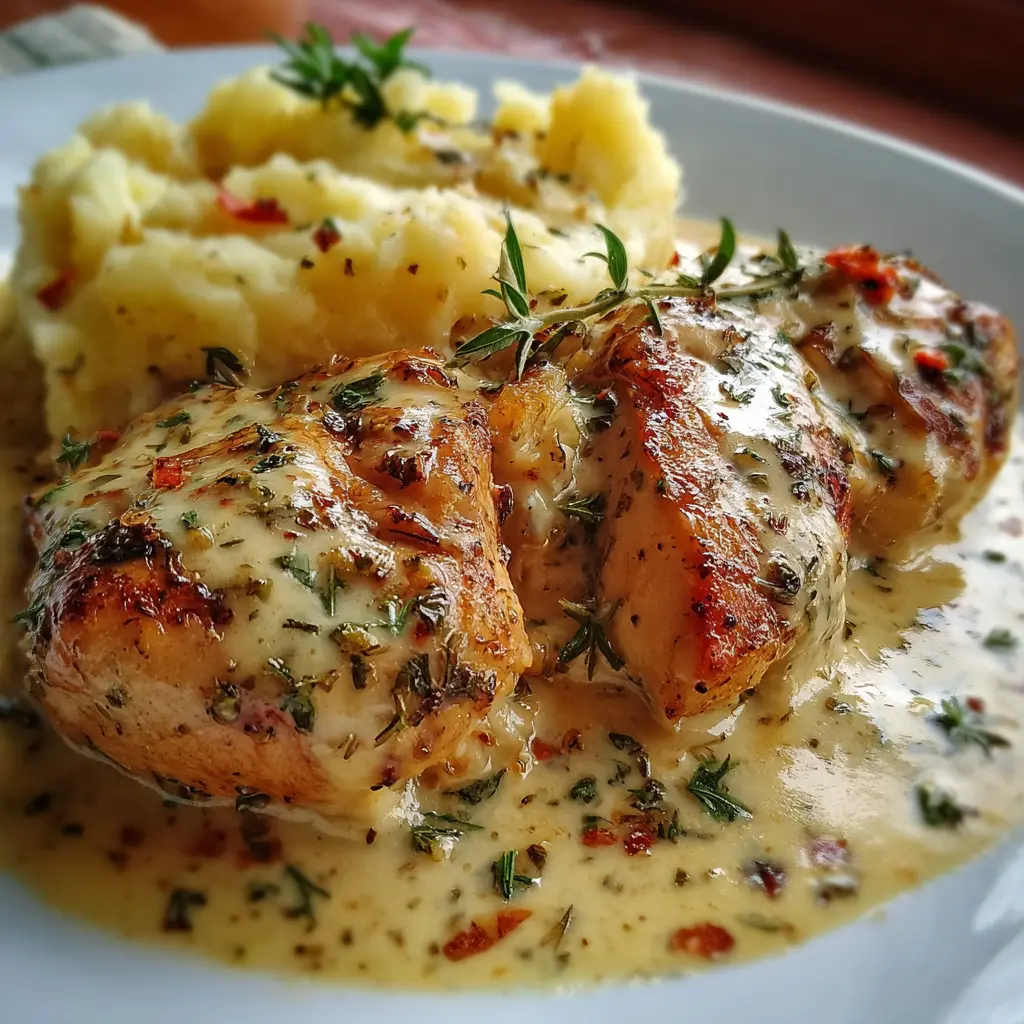 Disfruta de un delicioso pollo cremoso acompañado de un suave puré de patatas al ajo, perfecto para una cena rápida y satisfactoria.