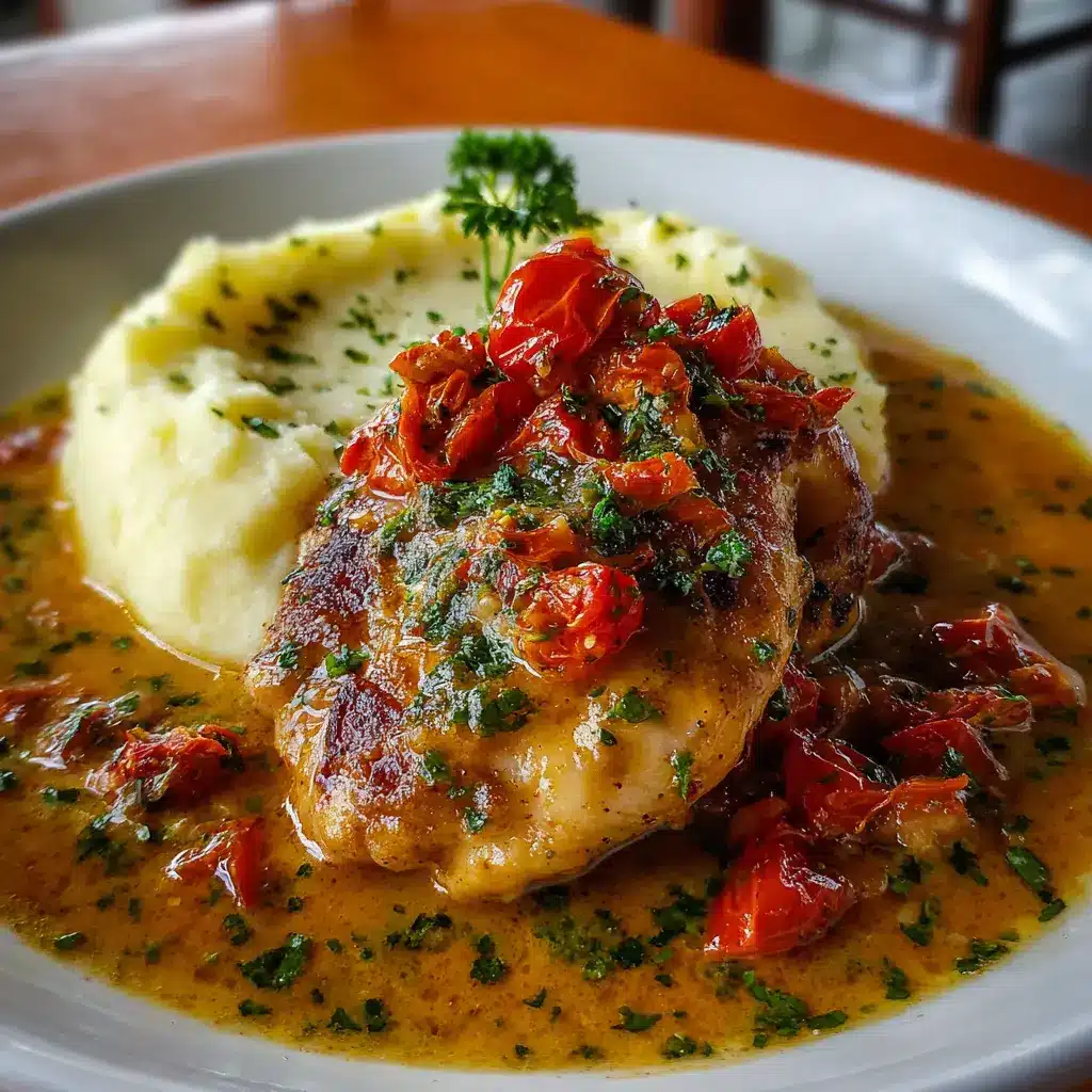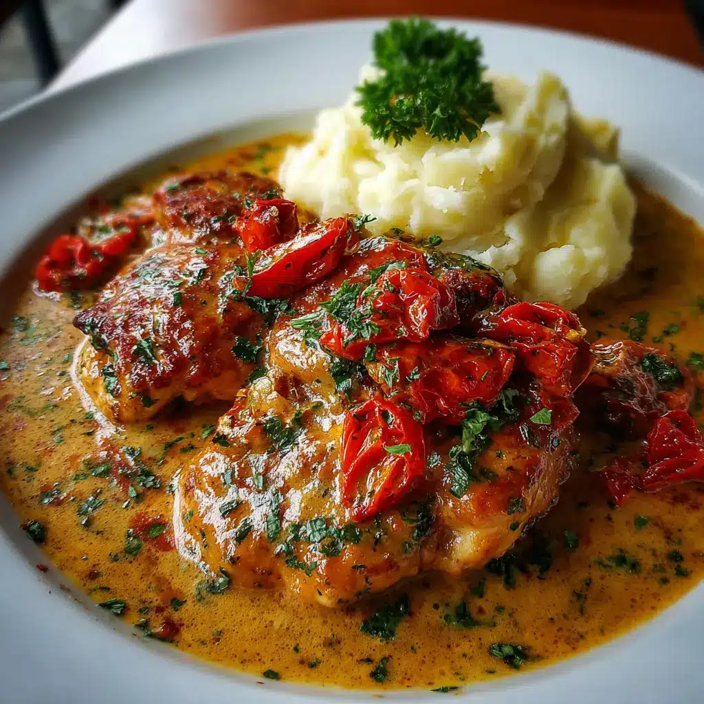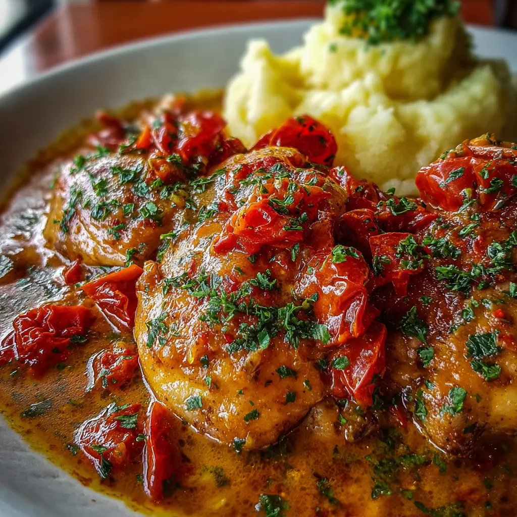Disfruta de un delicioso pollo cremoso acompañado de tomates secos y un suave puré de papas casero. Ideal para una cena rápida y sabrosa.