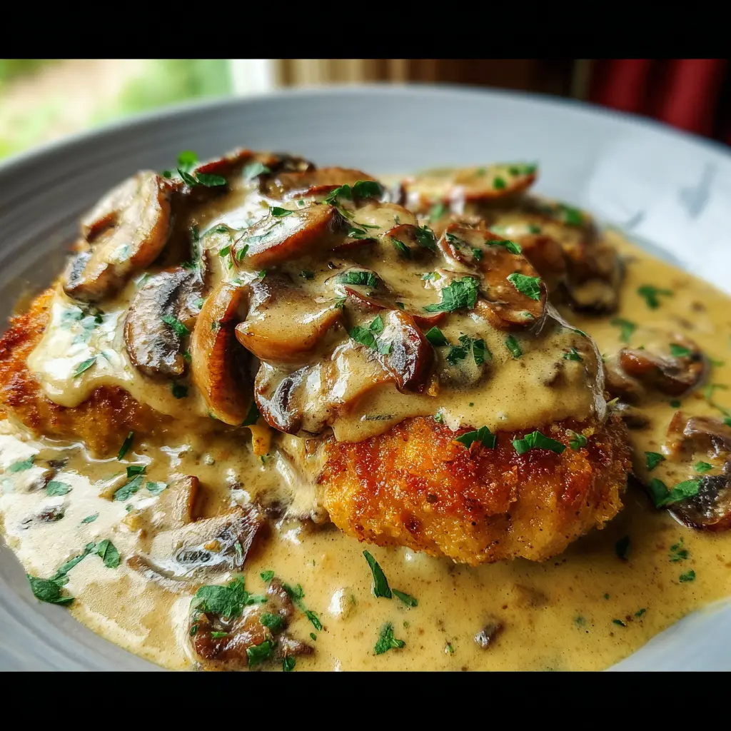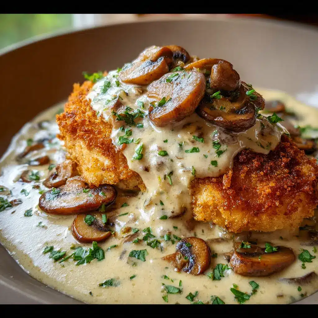 Disfruta de esta deliciosa receta de pollo empanizado en una cremosa salsa de champiñones, perfecta para cualquier ocasión.