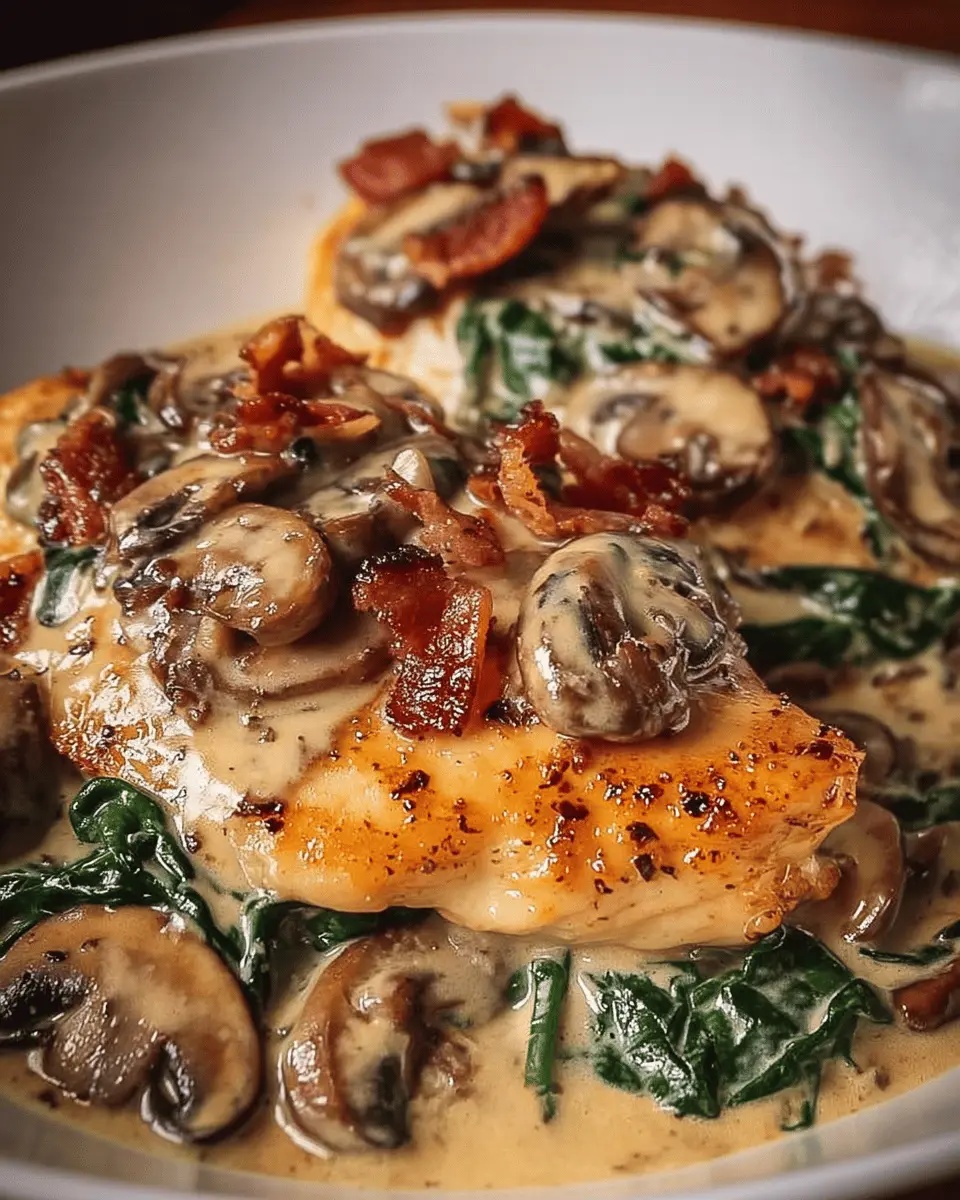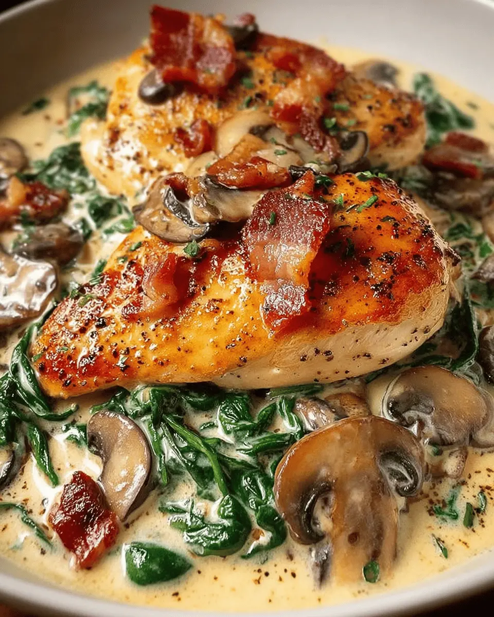 Pollo en Crema de Champiñones: Delicioso con Espinacas y Pavo Bacon