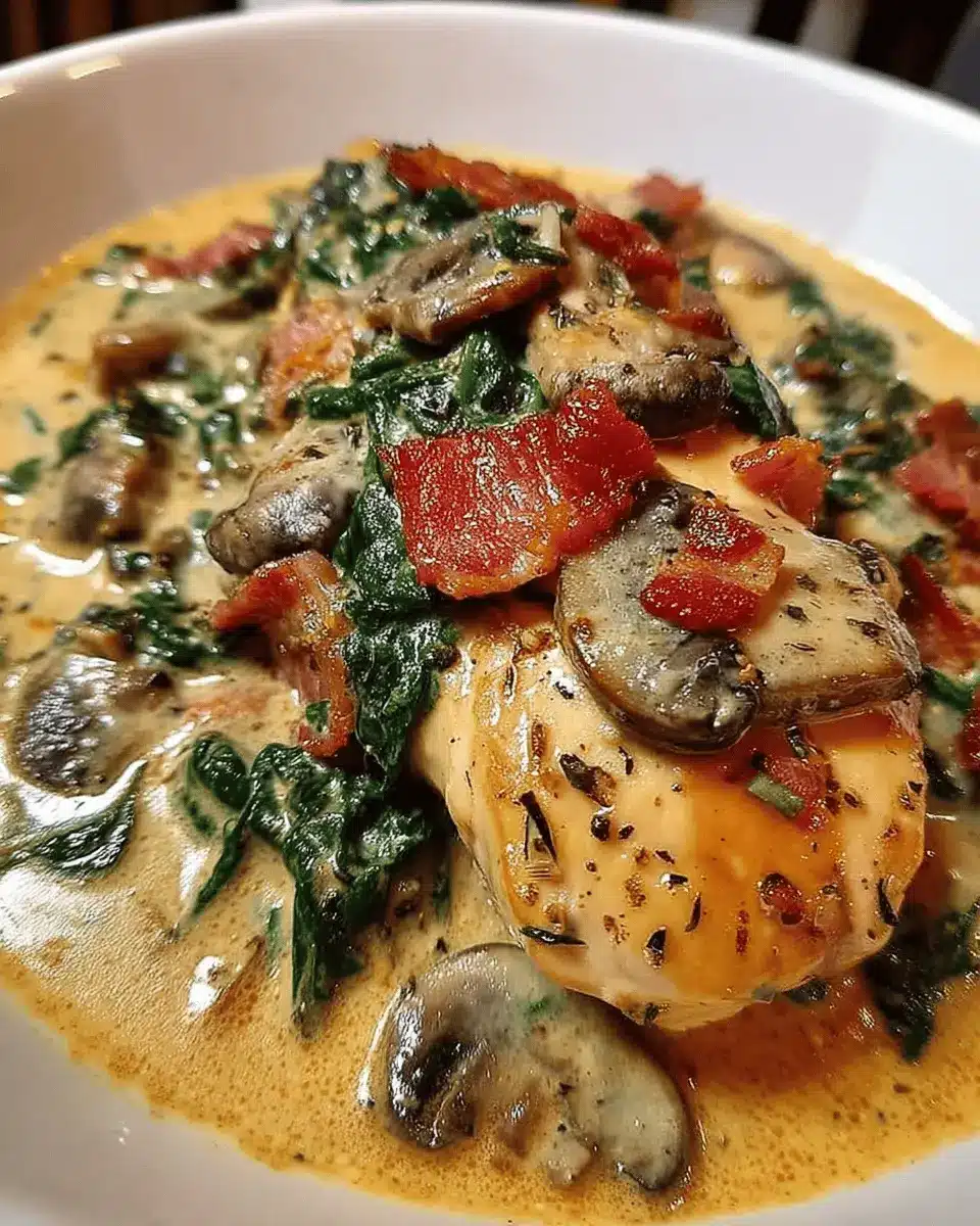 Disfruta de un delicioso pollo en crema de champiñones con espinacas y tocineta, ideal para una cena reconfortante.