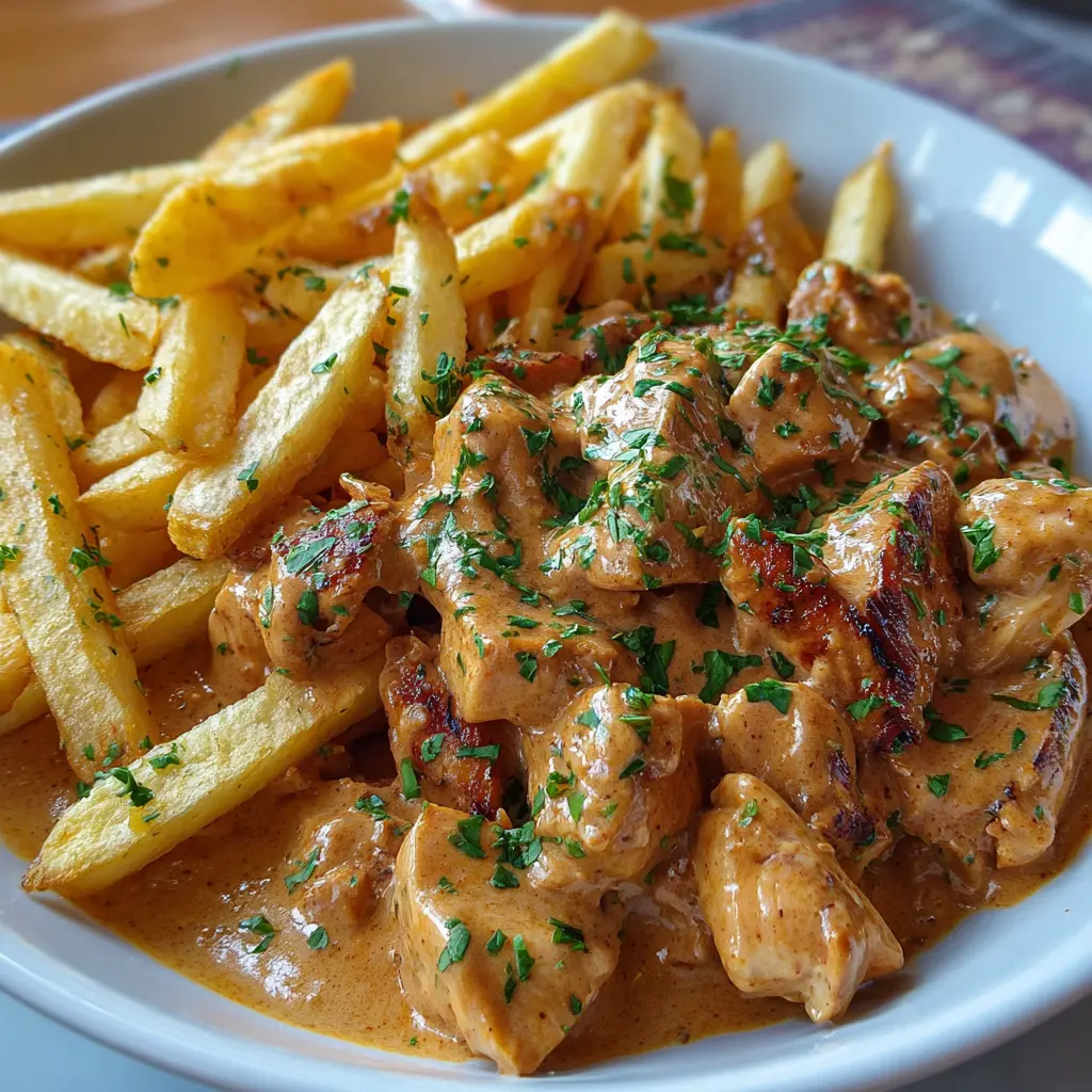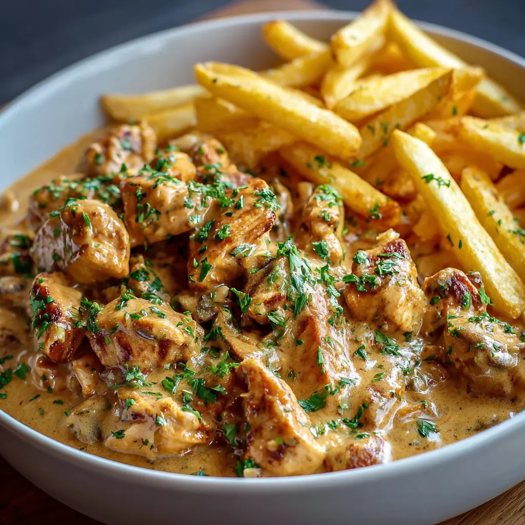 Descubre cómo preparar un delicioso Pollo Stroganoff cremosa acompañado de crujientes papas fritas. Perfecto para una cena familiar o una ocasión especial.