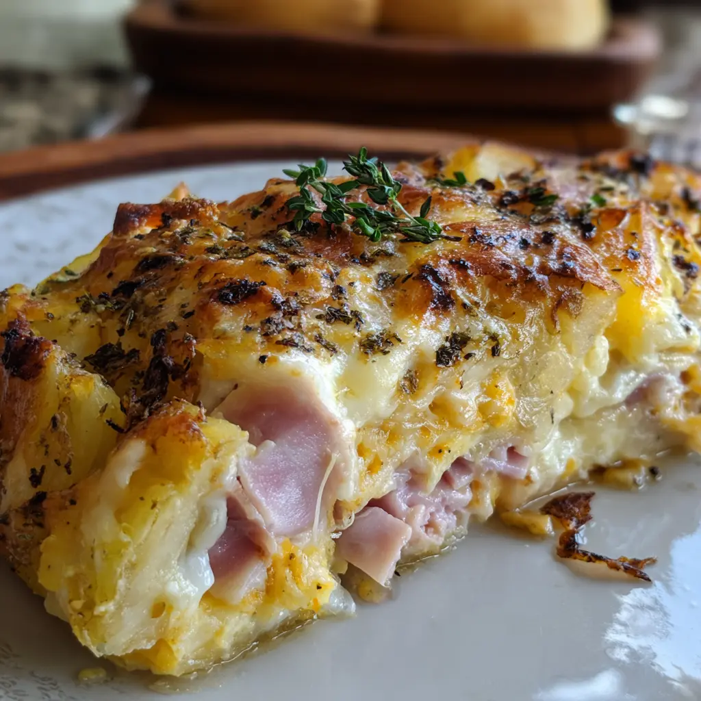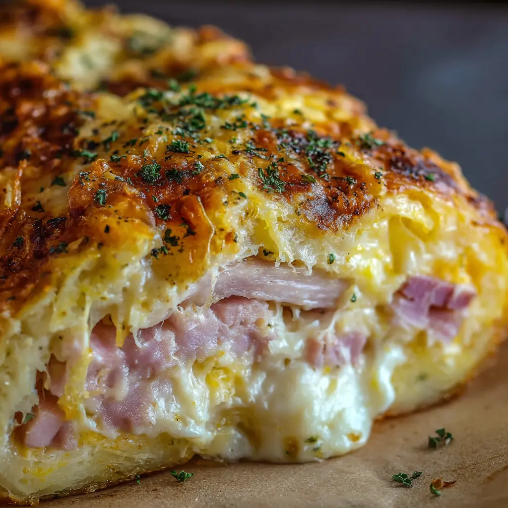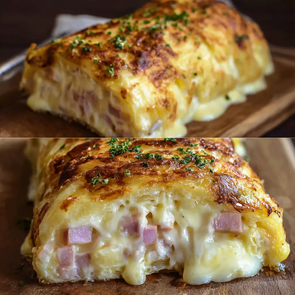 Disfruta de este delicioso rollo de papa lleno de queso y jamón de pollo, que se convierte en un plato cremoso y dorado, perfecto para cualquier ocasión.