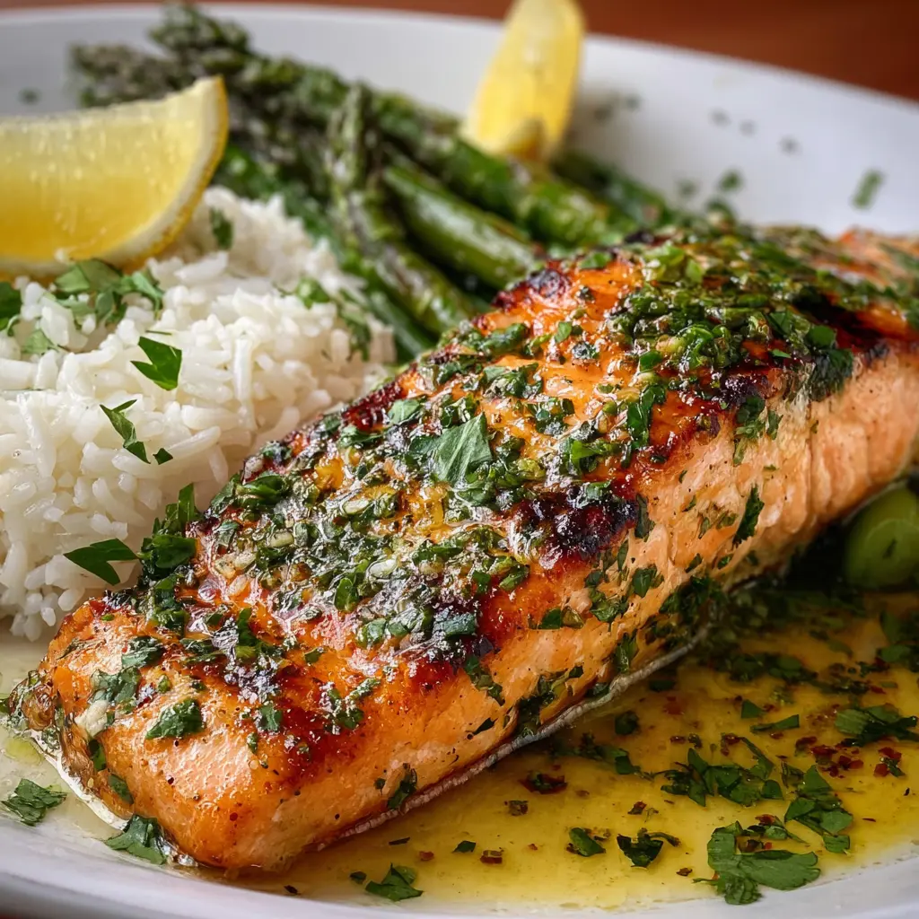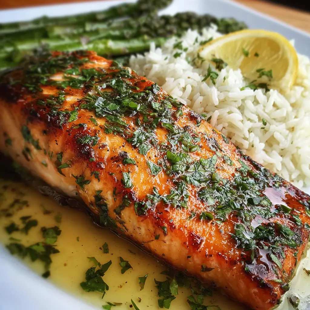 Disfruta de una deliciosa receta de salmón al limón y hierbas, acompañado de arroz y espárragos. Perfecto para una comida saludable y rápida.
