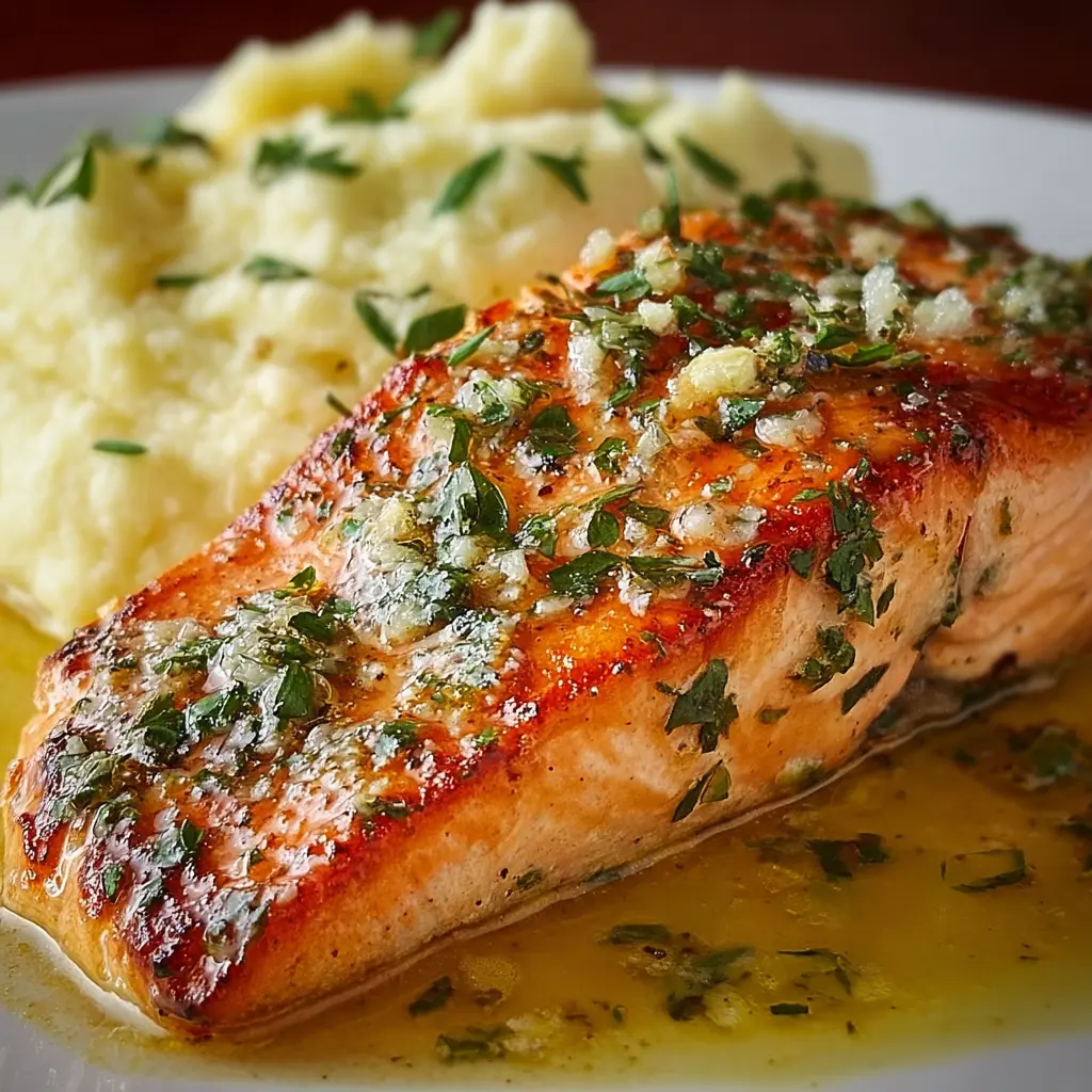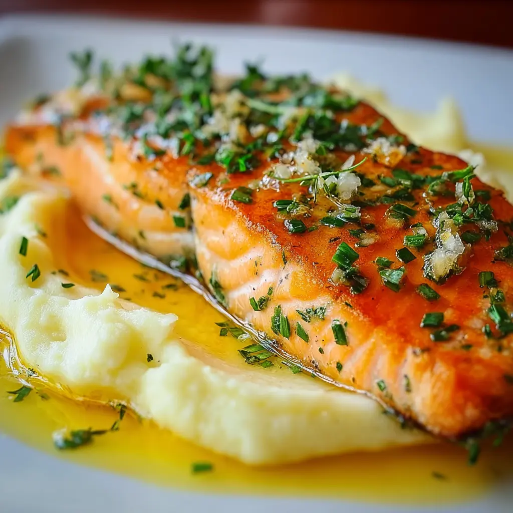Este plato no solo es delicioso, sino también nutritivo. El salmón con mantequilla y ajo nutritivo, lleno de ácidos grasos omega-3, y combinado con el puré cremoso de papas, hace de esta receta una elección perfecta para un almuerzo o cena.