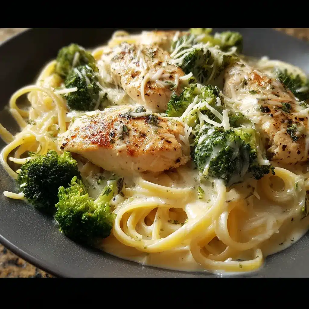 Un plato cremoso y delicioso que combina spaguetti con pollo y brócoli, ideal para una cena sencilla en casa.