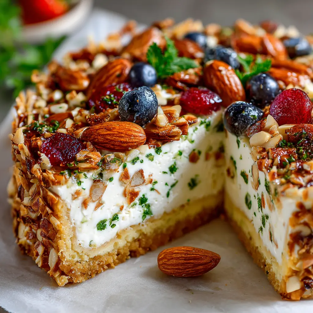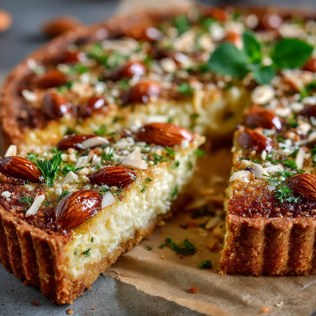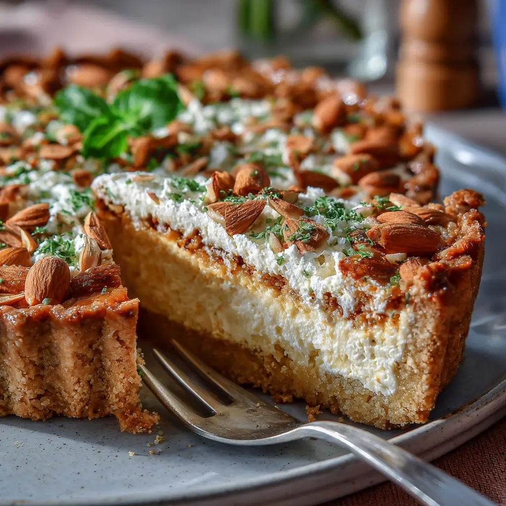 Disfruta de una deliciosa tarta salada que combina la cremosidad de la ricota con el crujiente de las almendras, perfecta para un almuerzo o cena saludable.