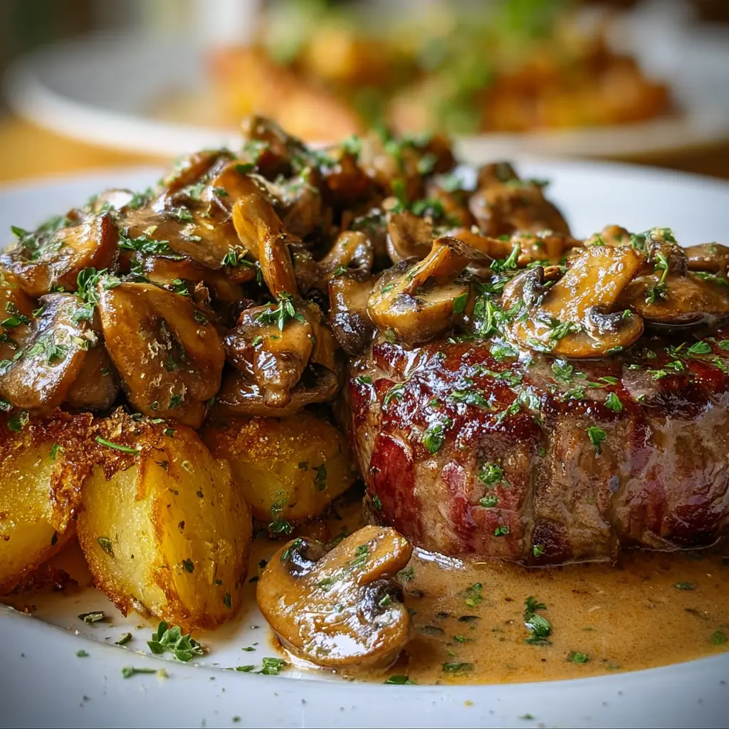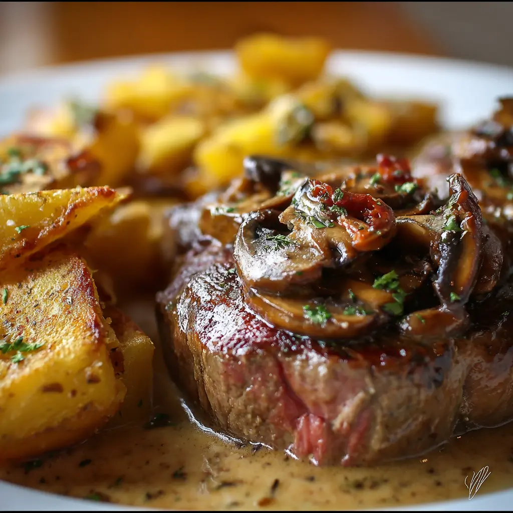 Deléitate con un delicioso tournedo de lomo y hongos, acompañado de papas crocantes, perfecto para cualquier ocasión especial.
