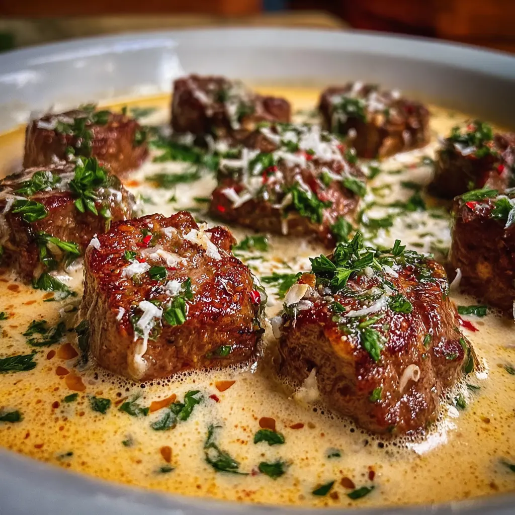Introducción a los Trocitos de Carne en Salsa de Mantequilla de Ajo con Crema de Parmesano