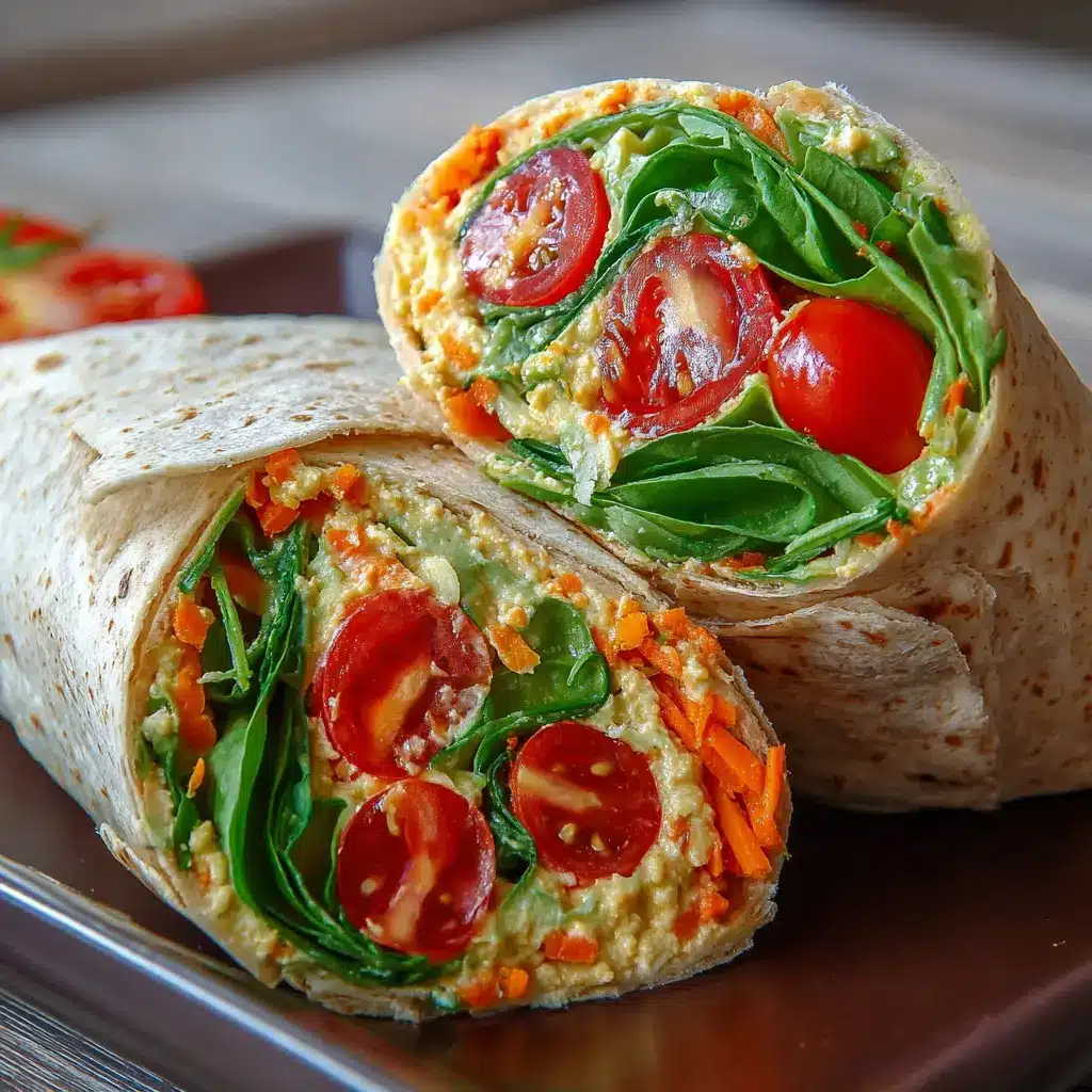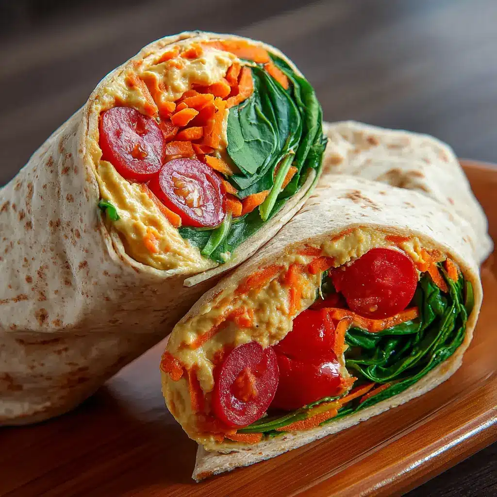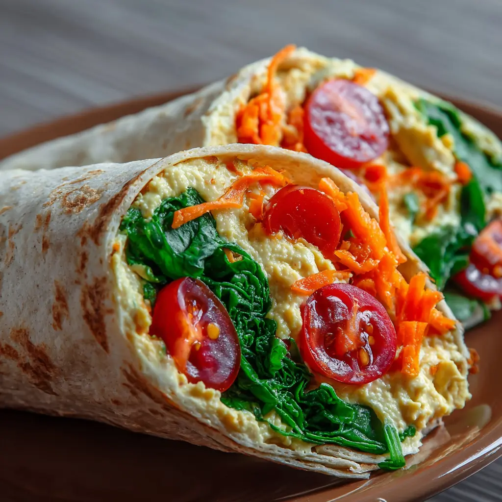 Ingredientes frescos y coloridos: Este wrap no solo es nutritivo, sino también vibrante. Las espinacas aportan hierro y vitaminas, mientras que los tomates cherry añaden antioxidantes. La zanahoria, rica en betacarotenos, proporciona un crujido perfecto que complementa la suavidad del hummus.